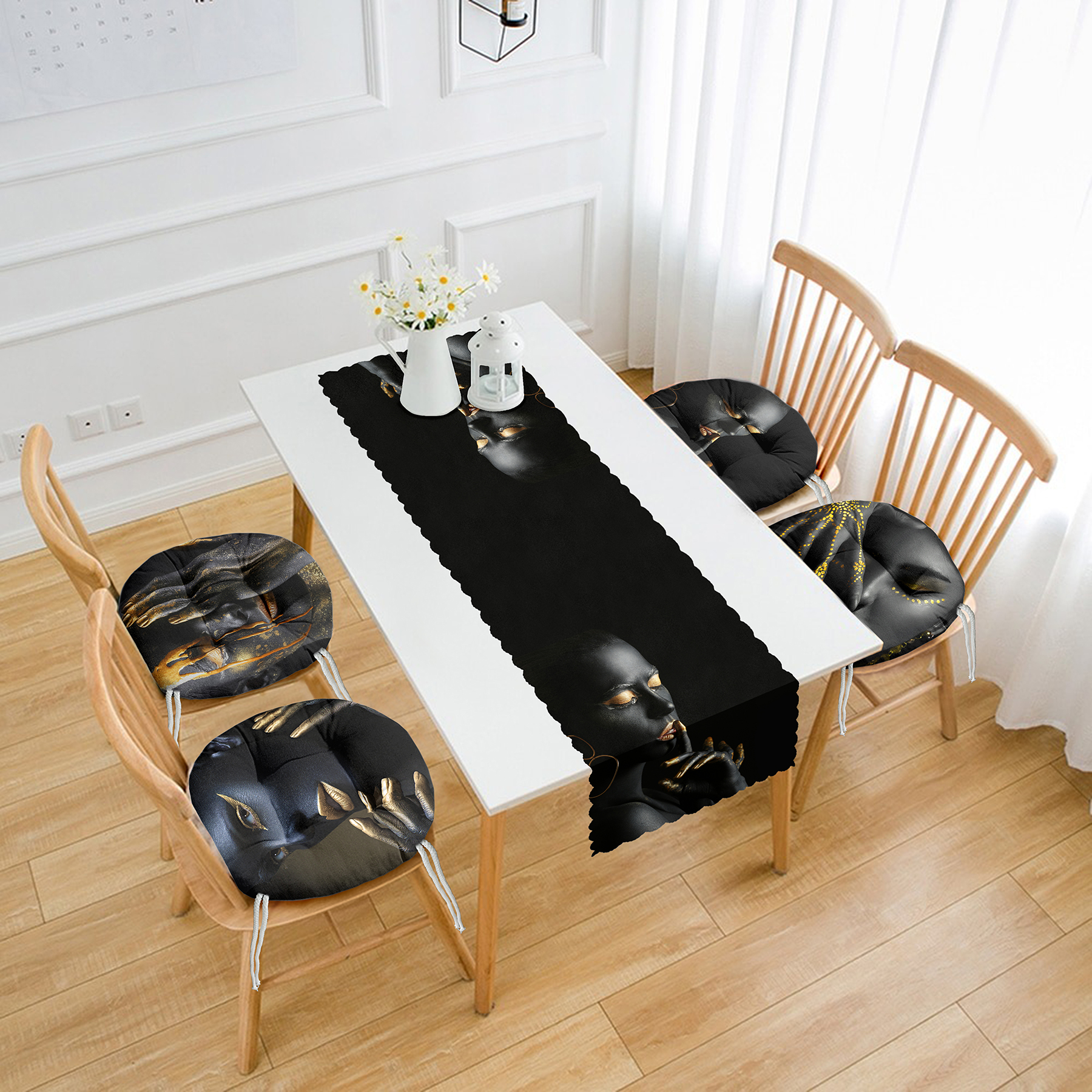 Siyah Zeminde Siyahi Kadın Tasarımları 4 Yuvarlak Pofuduk Sandalye Minderi ve 1 Runner Seti Realhomes