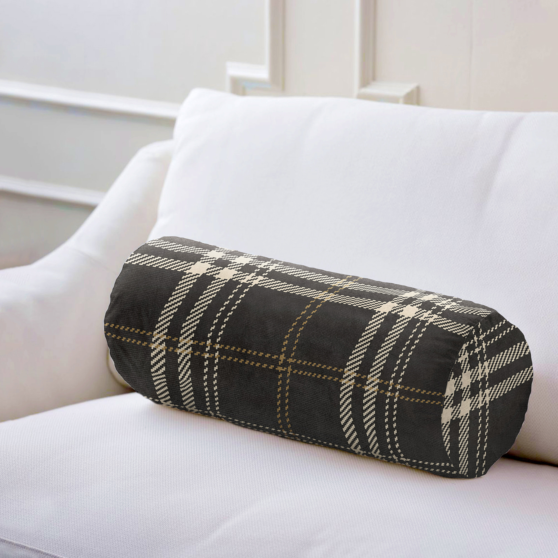 Siyah Zeminli Ekose Desenli Dijital Baskılı Dekoratif İç Dolgulu – Fermuarlı Süet Silindir Daire Yastık Kırlent