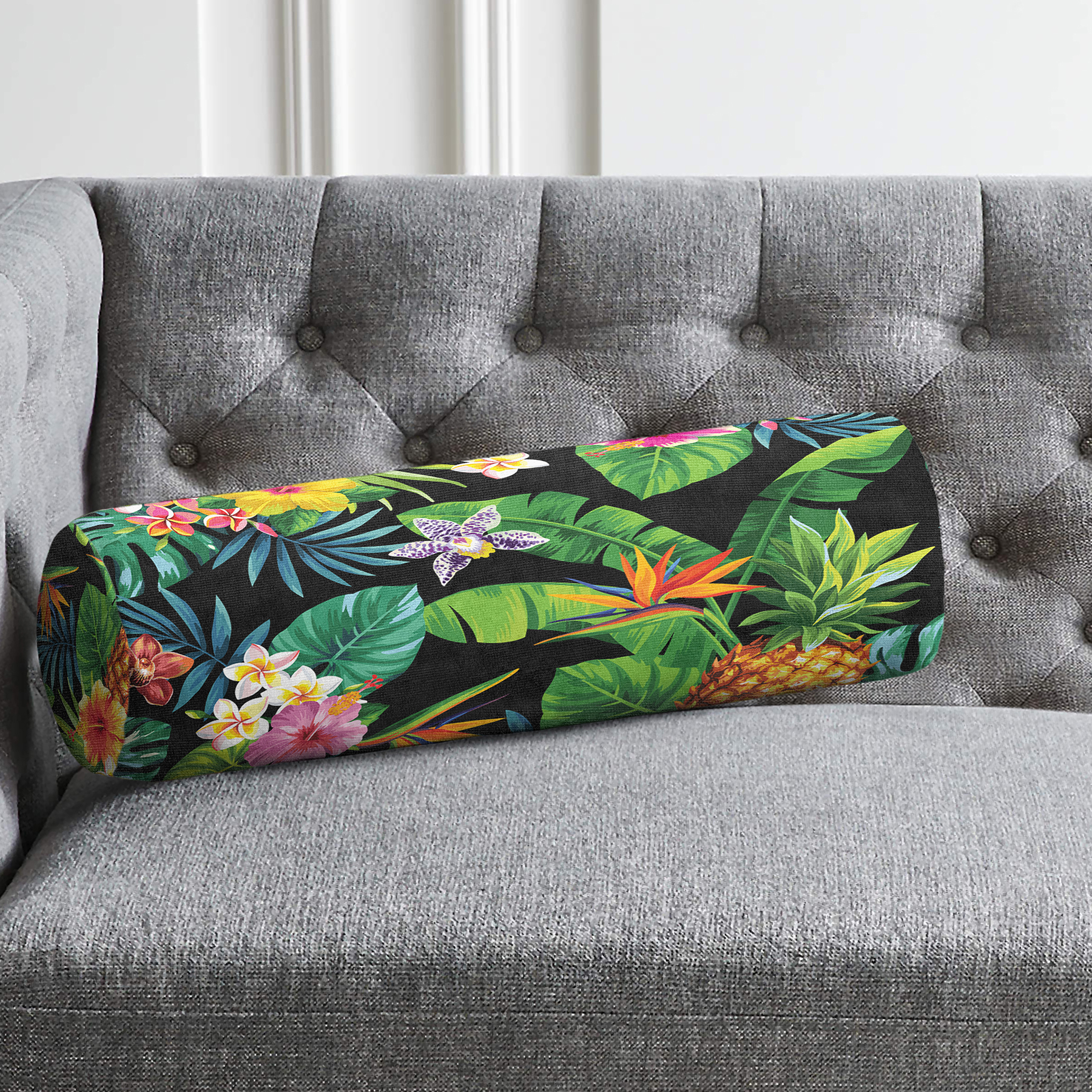 Siyah Zeminli Geometrik Yapraklar Desenli İç Dolgulu – Fermuarlı Süet Silindir Yuvarlak Yastık Kırlent