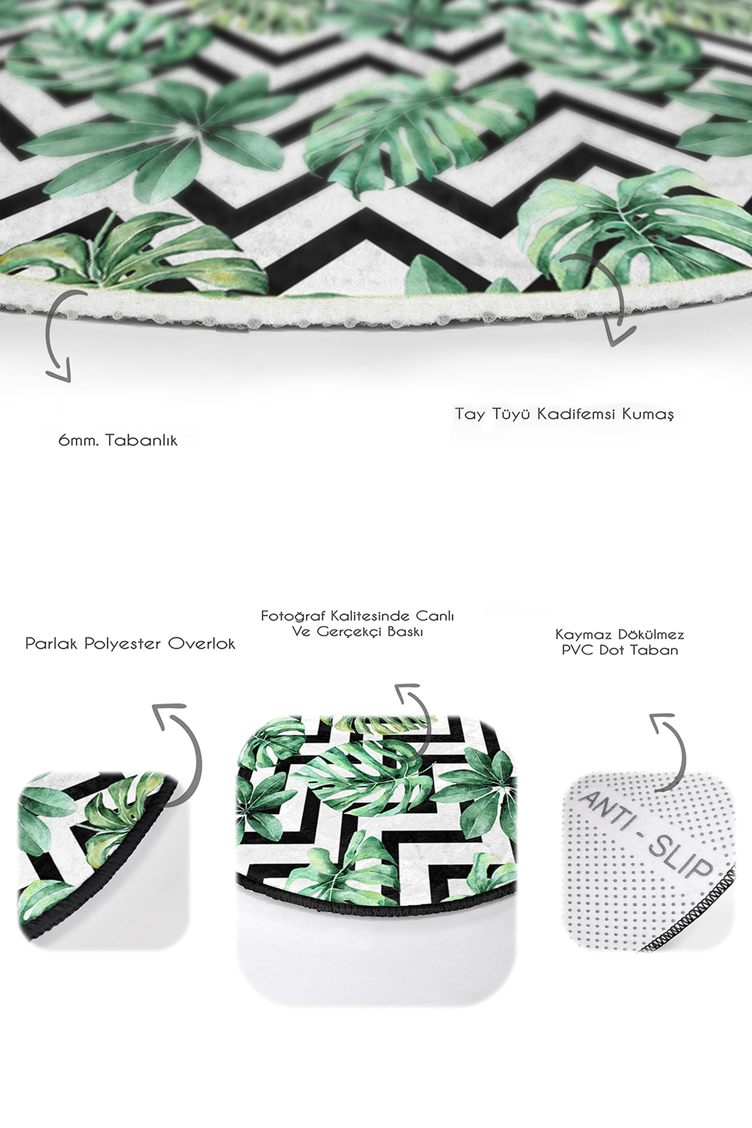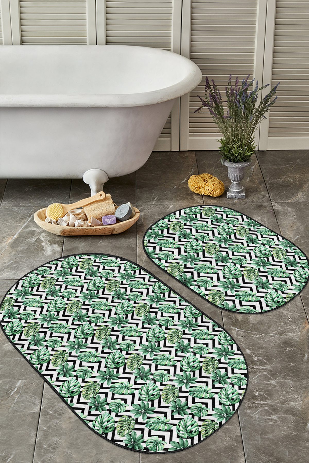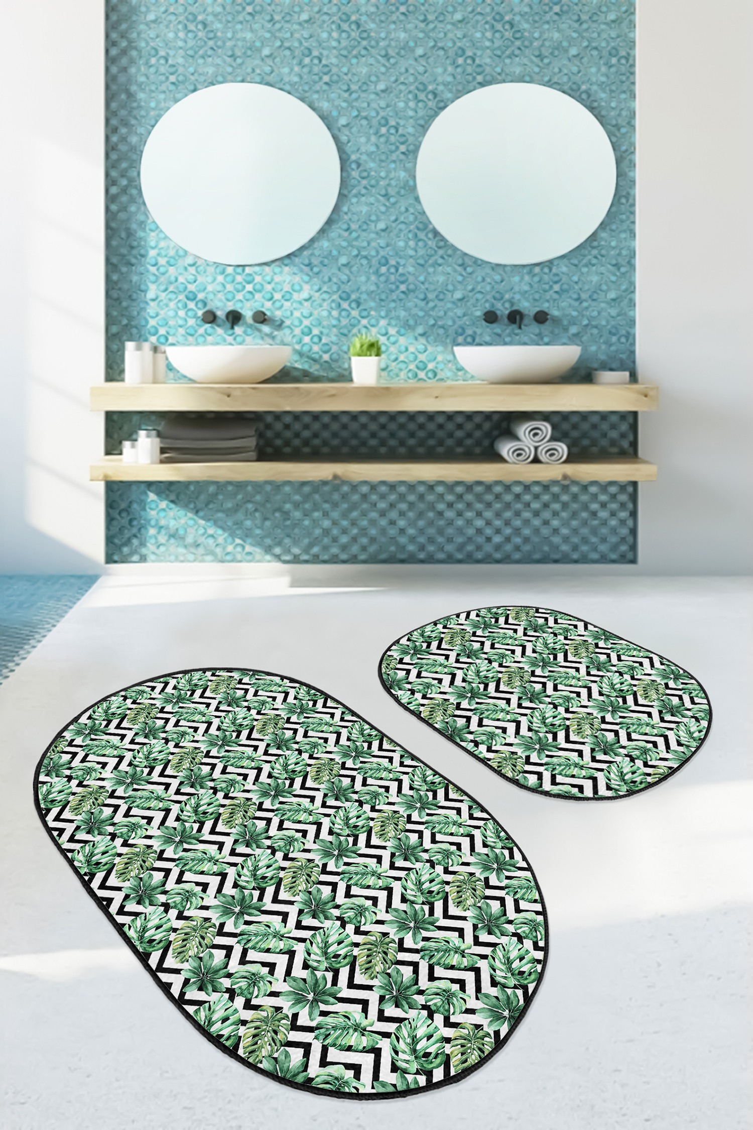 Siyah Zigzag Zemin Tropik Yeşil Yapraklar 2’li Oval Kaymaz Tabanlı Banyo & Mutfak Paspas Takımı