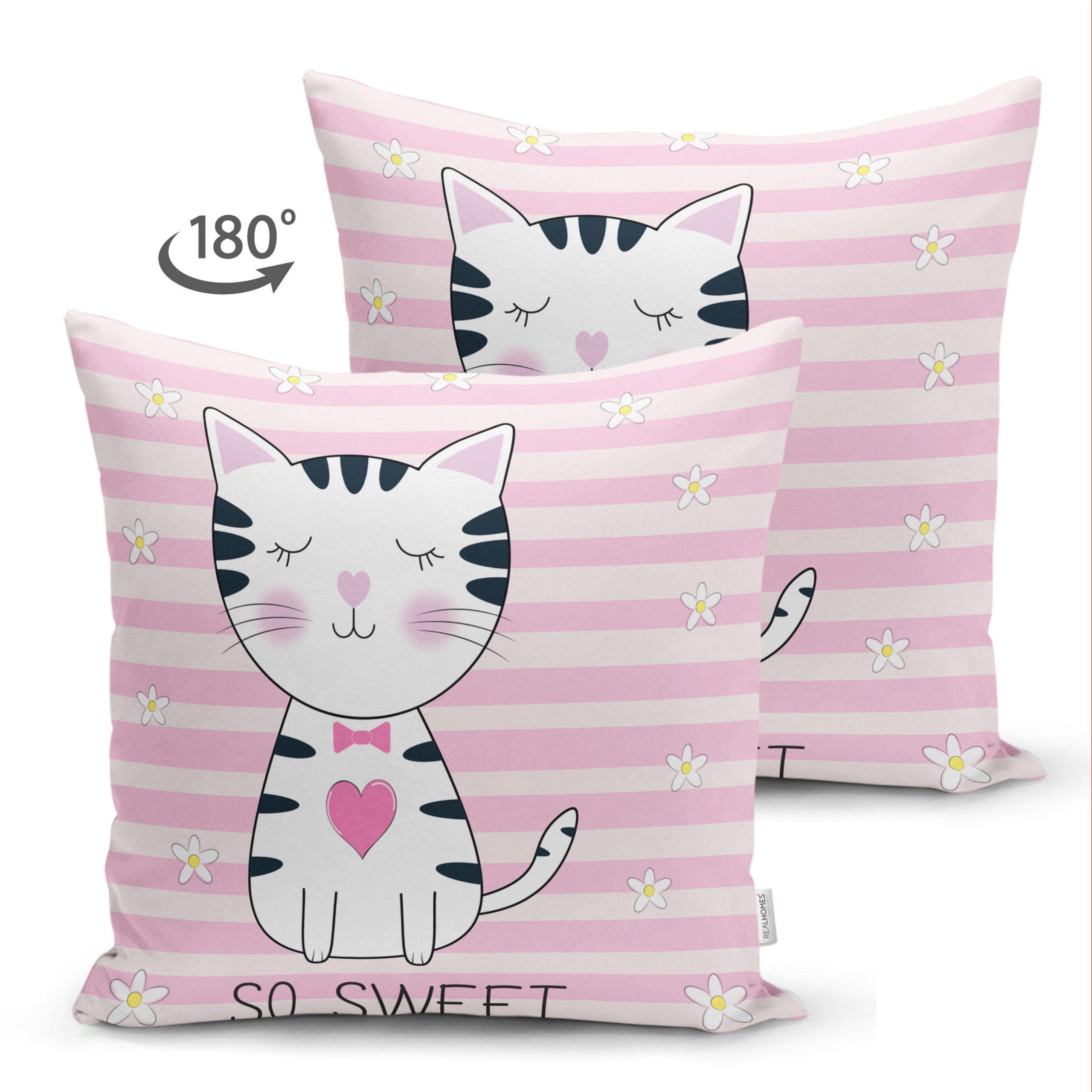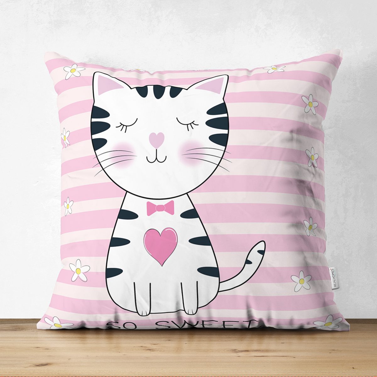 So Sweet Pembe Çizgili Sevimli Kedi Modern Çift Taraflı Süet Yastık Kırlent Kılıfı Realhomes