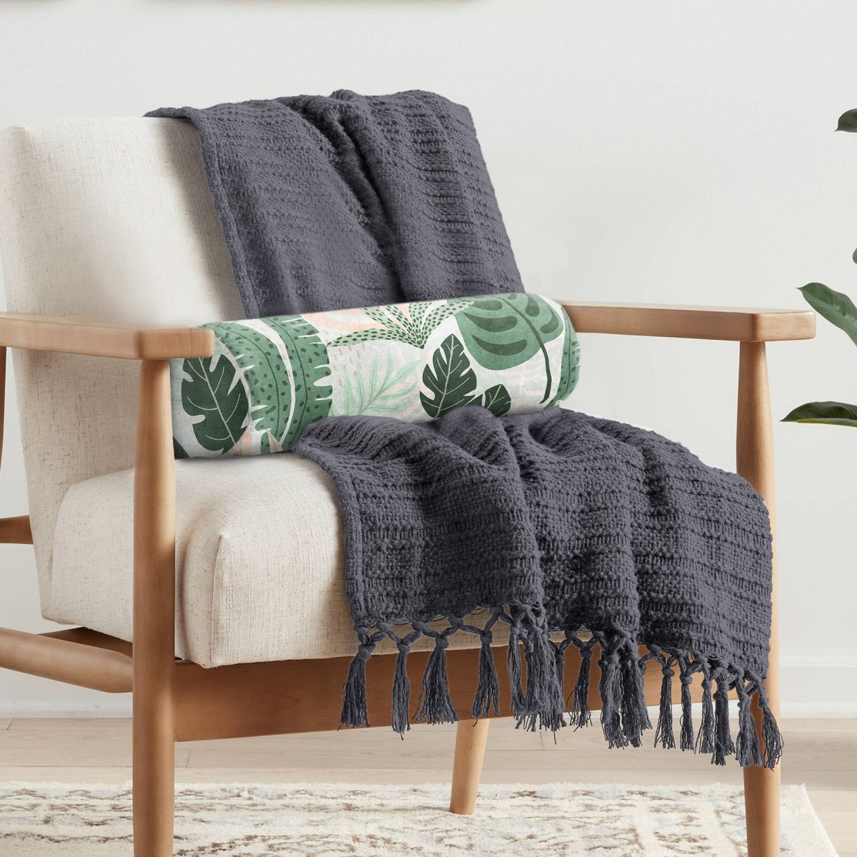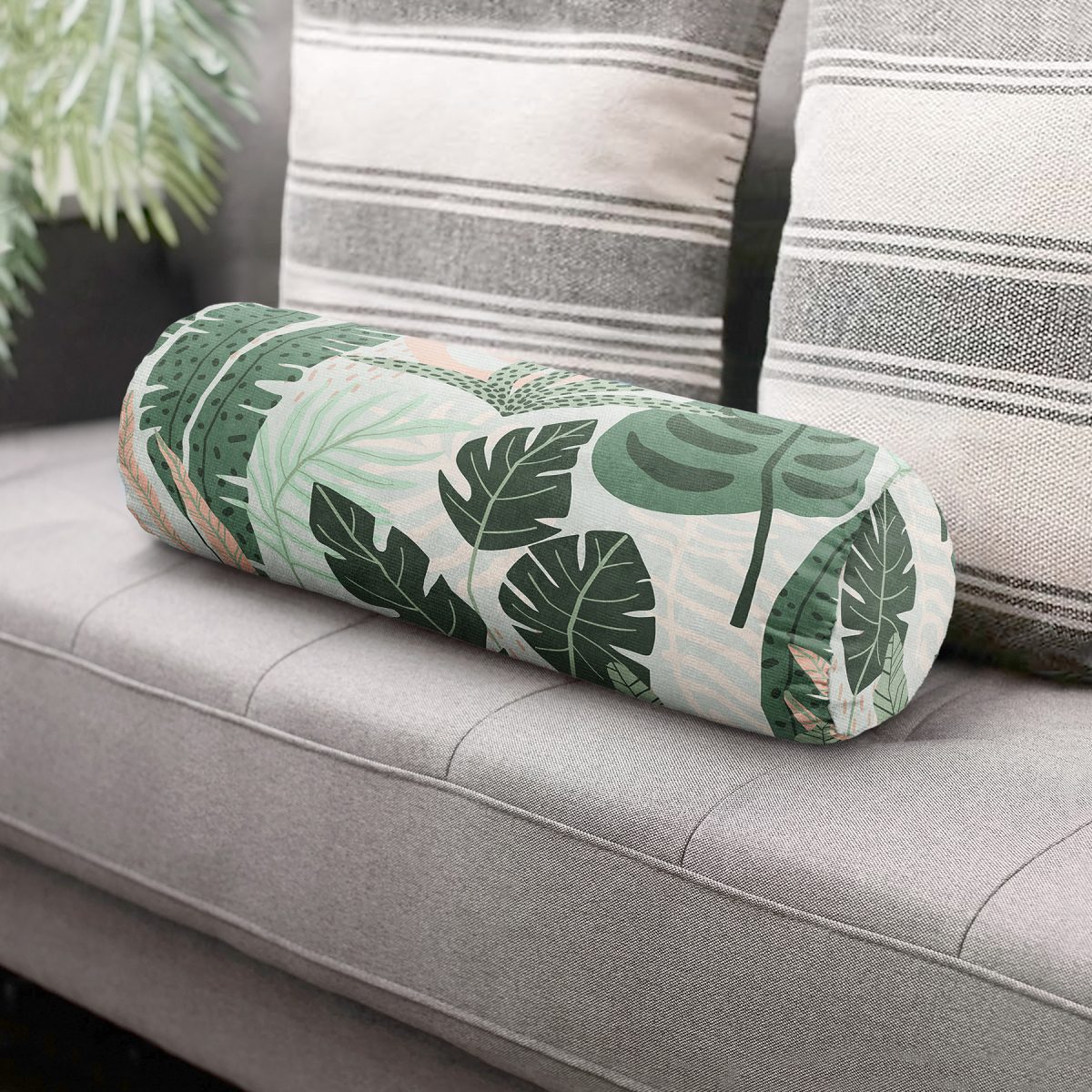 Soft Renkli Zemin Üzerinde Koyu Renkli Yaprak Desenli Dijital Baskılı Modern İç Dolgulu – Fermuarlı Süet Silindir Yuvarlak Yastık Kırlent