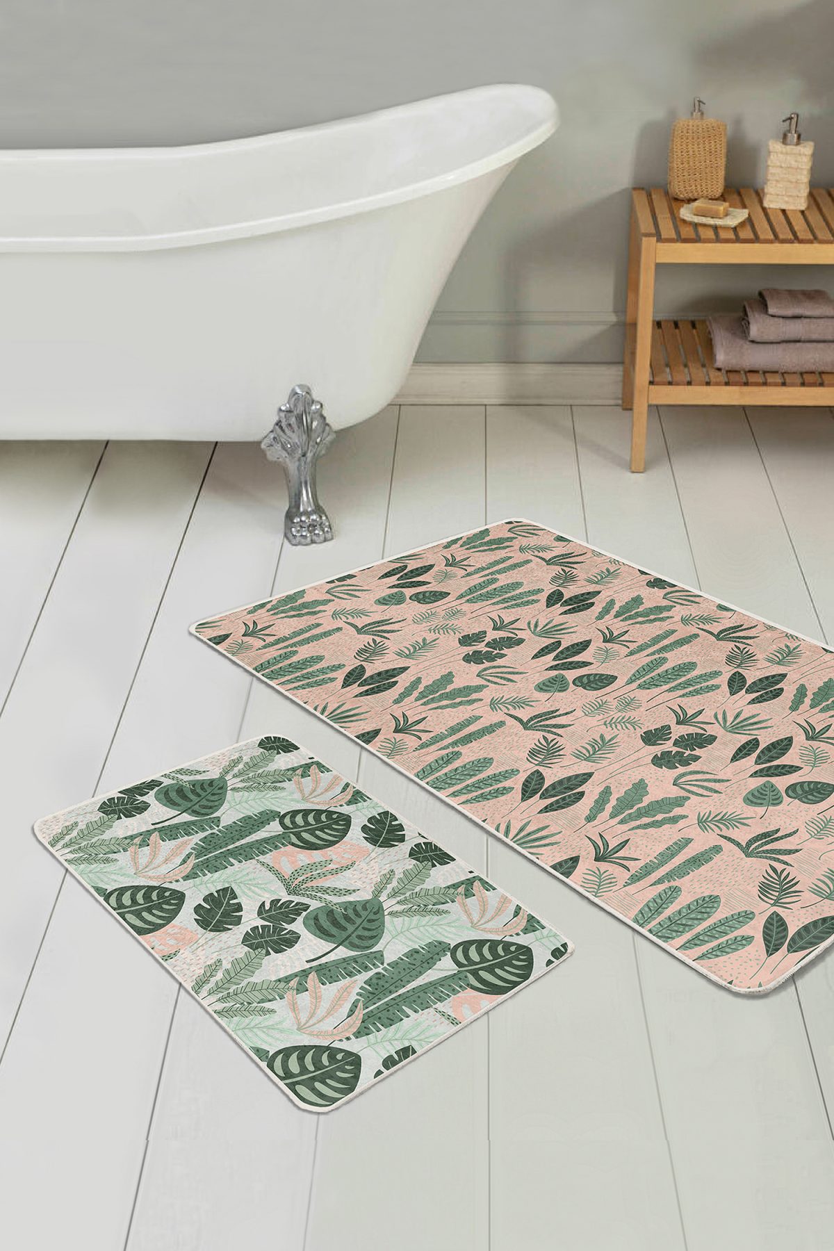 Soft Zemin Tropik Yapraklar Dijital Baskılı 2’li Kaymaz Tabanlı Banyo & Mutfak Paspas Takımı