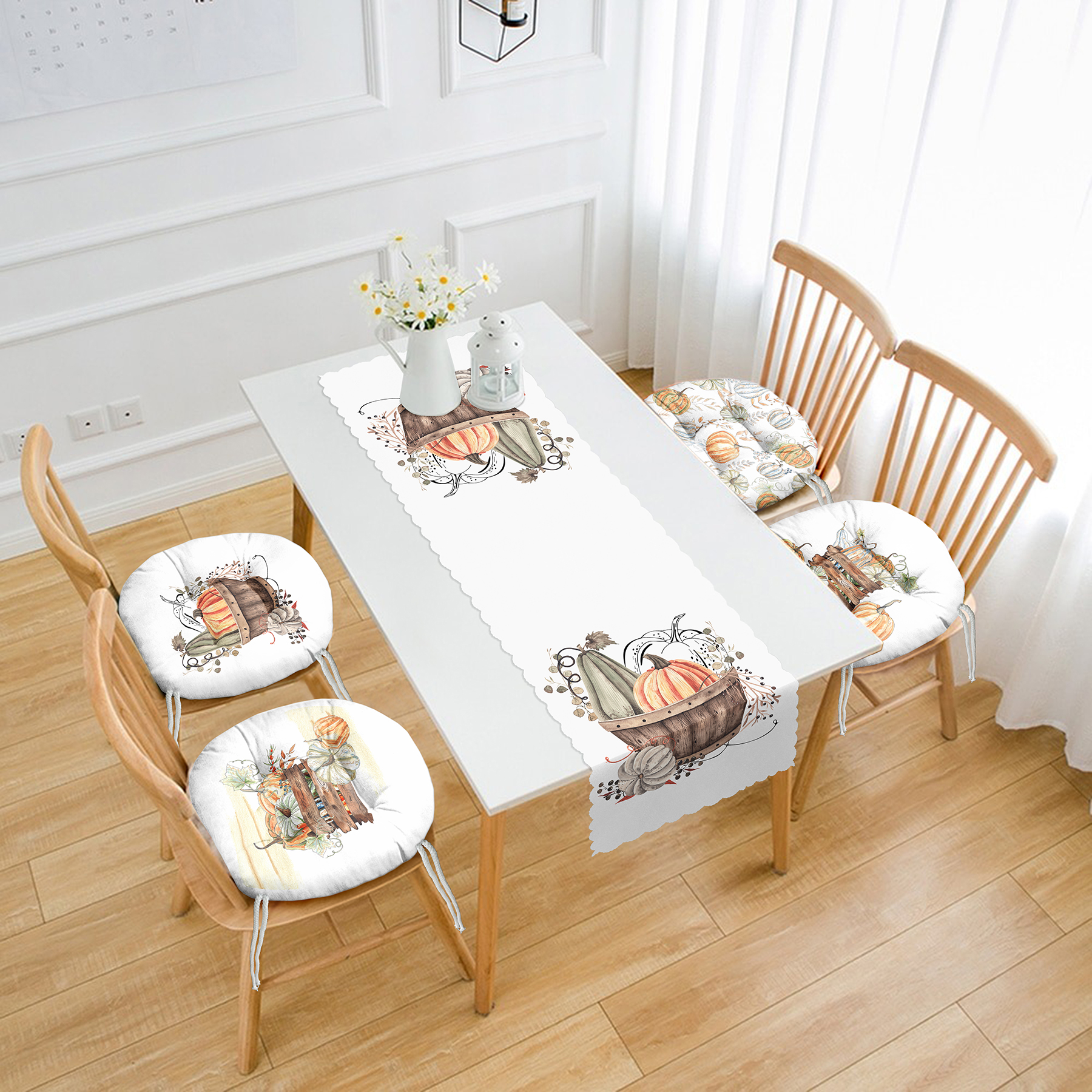 Sonbahar Temalı Kabak Motifli 4 Yuvarlak Pofuduk Sandalye Minderi ve 1 Runner Seti