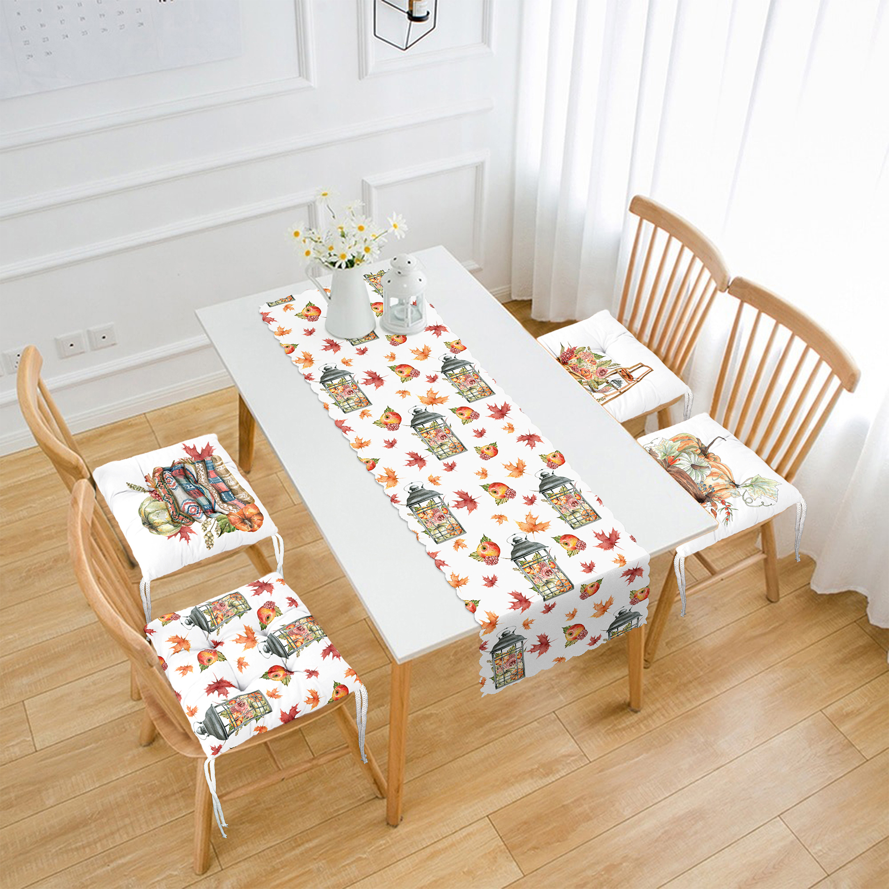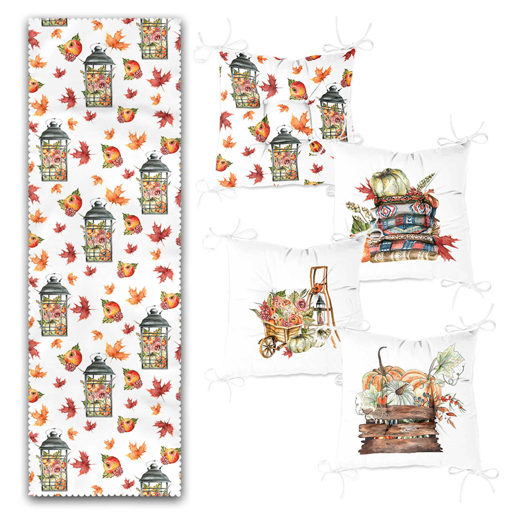 Sonbahar Temalı Kabak Motifli 4 Pofuduk Sandalye Minderi ve 1 Runner Seti
