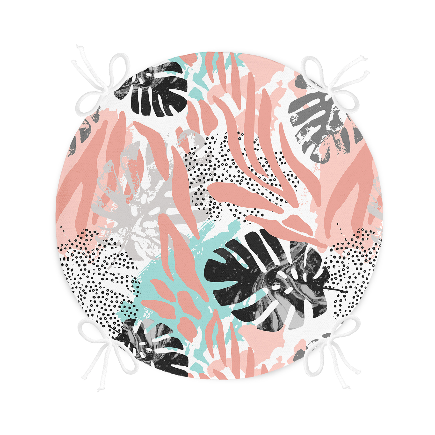 Soyut Çizimler İçerisinde Siyah Tropik Yaprak Motifli Yuvarlak Fermuarlı Sandalye Minderi