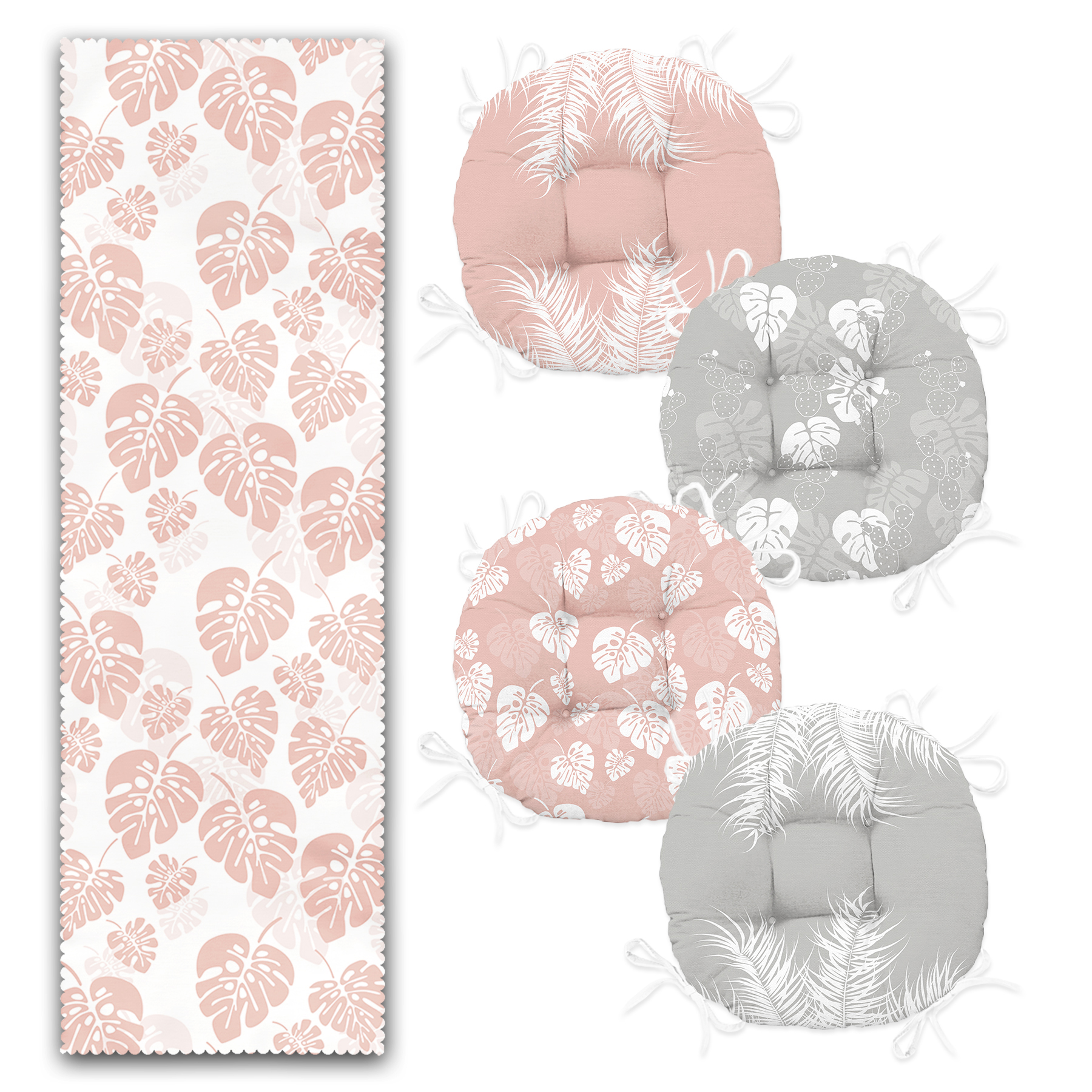 Soyut Pembe Gri Yaprak Tasarımlı 4 Yuvarlak Pofuduk Sandalye Minderi ve 1 Runner Seti Realhomes