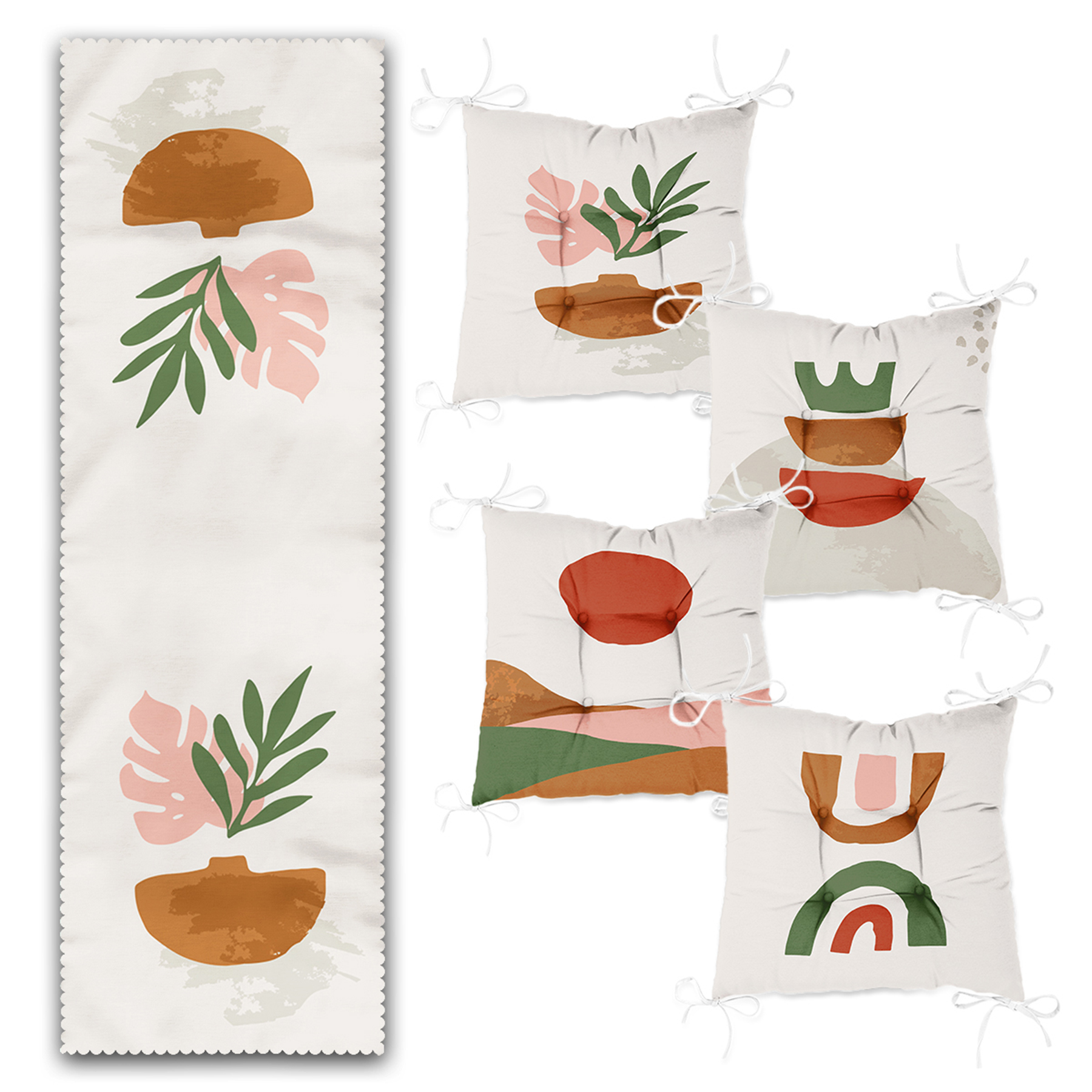 Soyut Renk Temalı 4 Pofuduk Sandalye Minderi ve 1 Runner Seti