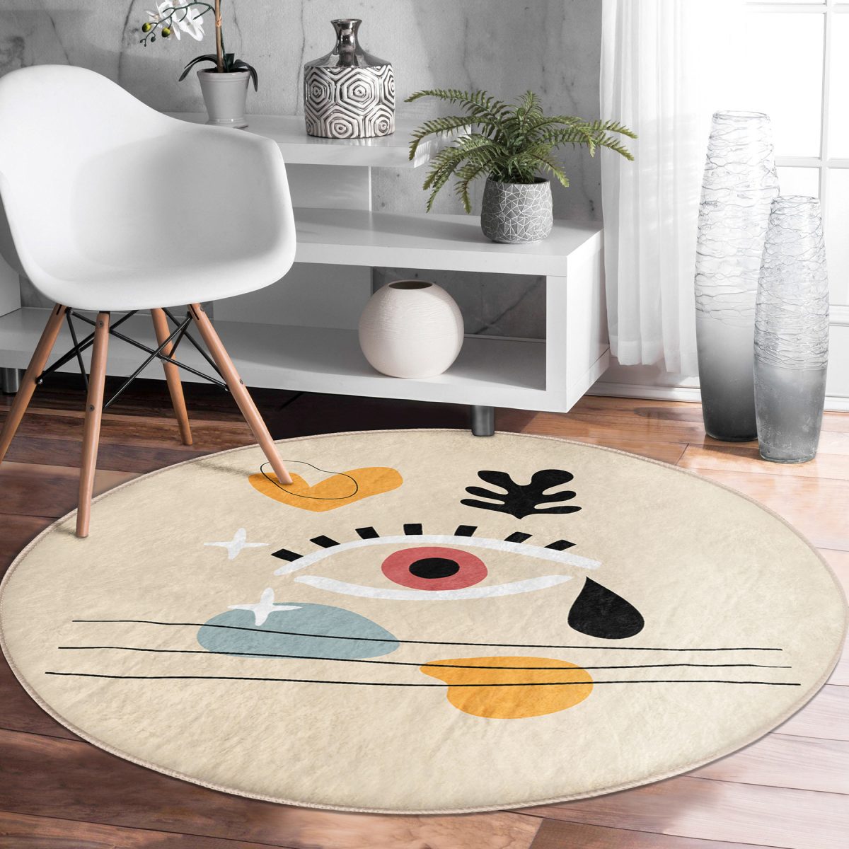 Soyut Tasarımlı Dijital Baskılı Renkli Salon ve Oturma Odası Yıkanabilir Kaymaz Tabanlı Yuvarlak Halı