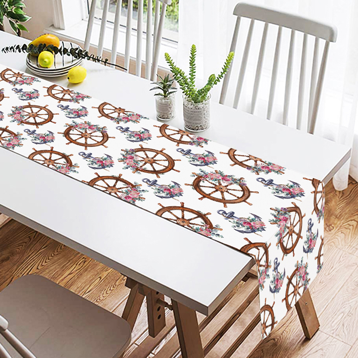 Beyaz Zemin Çapa & Dümen Tasarımlı Dijital Baskılı Dekoratif Süet Runner