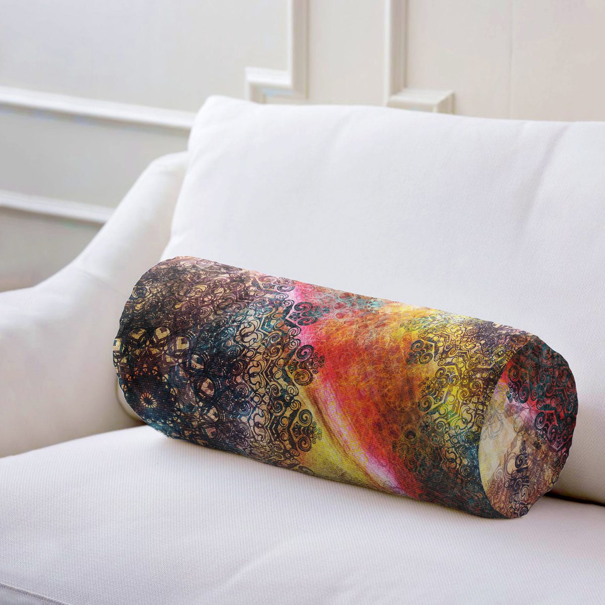 Sulu Boya Temalı Mandala Desenli Modern İç Dolgulu Süet Silindir Yastık Kırlent – Bel Yastığı