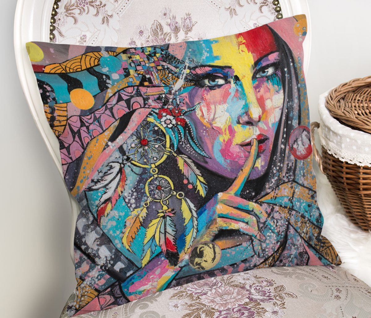 Sulu Boya Tüy Motifli Renkli Kadın Özel Tasarım Kırlent Kılıfı