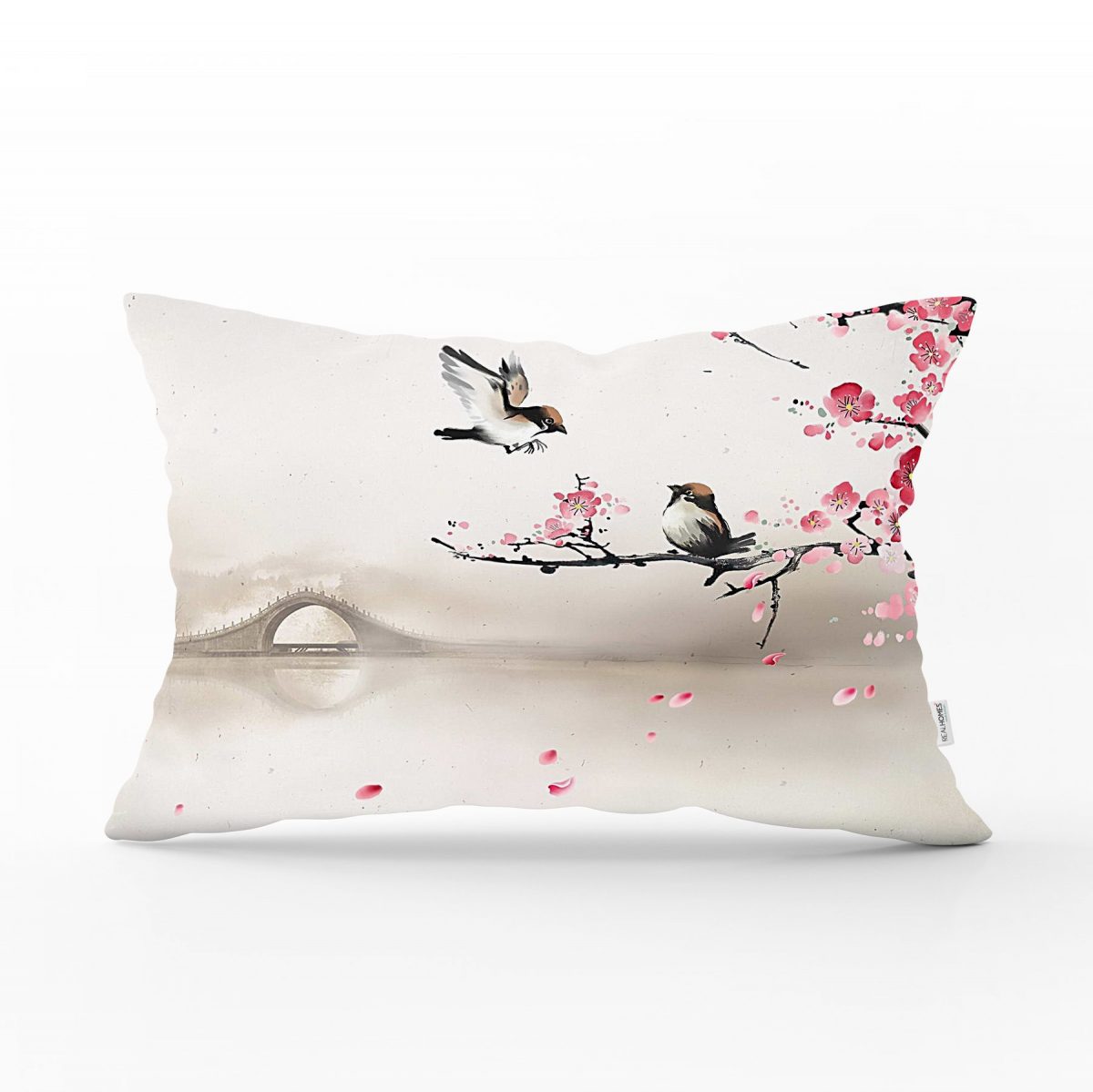 Suluboya Çizimde Serçeler Tasarımlı Dekoratif Dikdörtgen Yastık Kılıfı