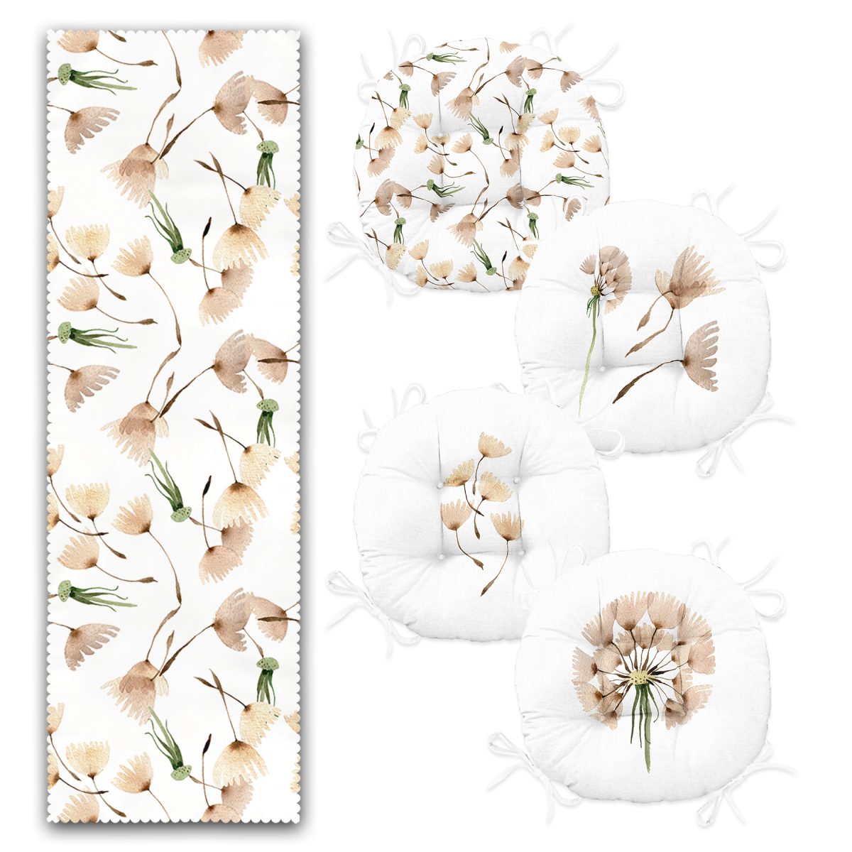 Suluboya Çizimli Karahindiba Tasarımlı 4 Yuvarlak Pofuduk Sandalye Minderi ve 1 Runner Seti Realhomes