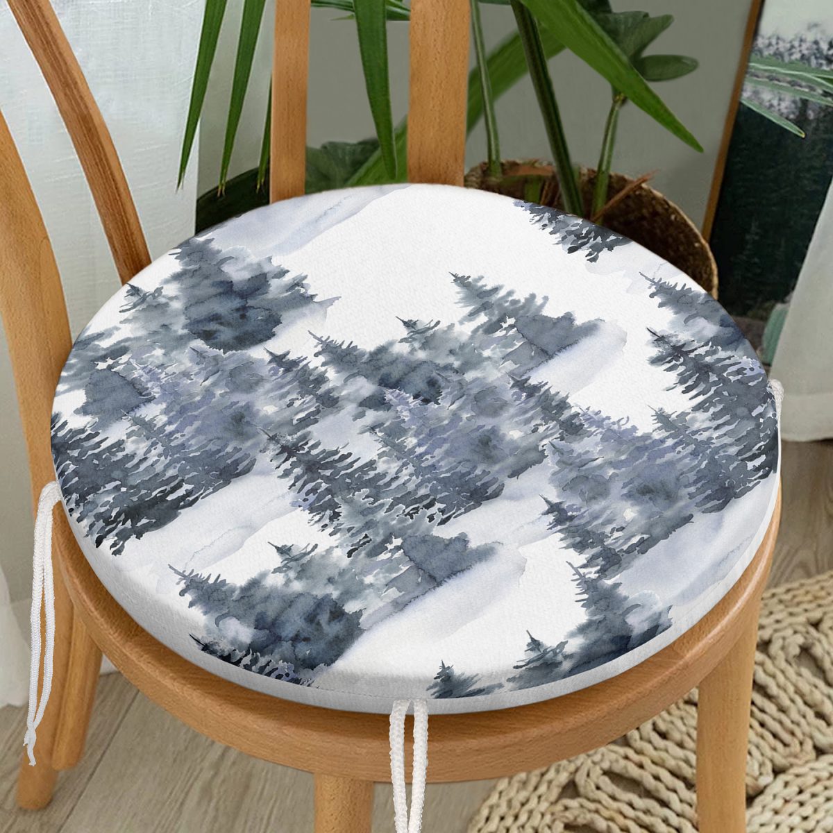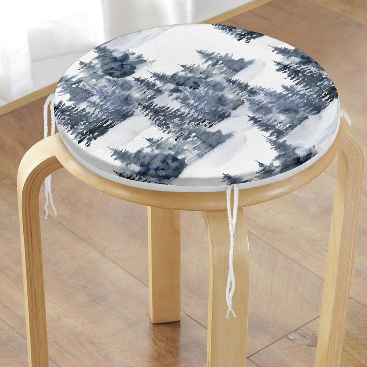 Suluboya Çizimli Kış Temalı Çam Ağaçları Dijital Baskılı Yuvarlak Fermuarlı Sandalye Minderi