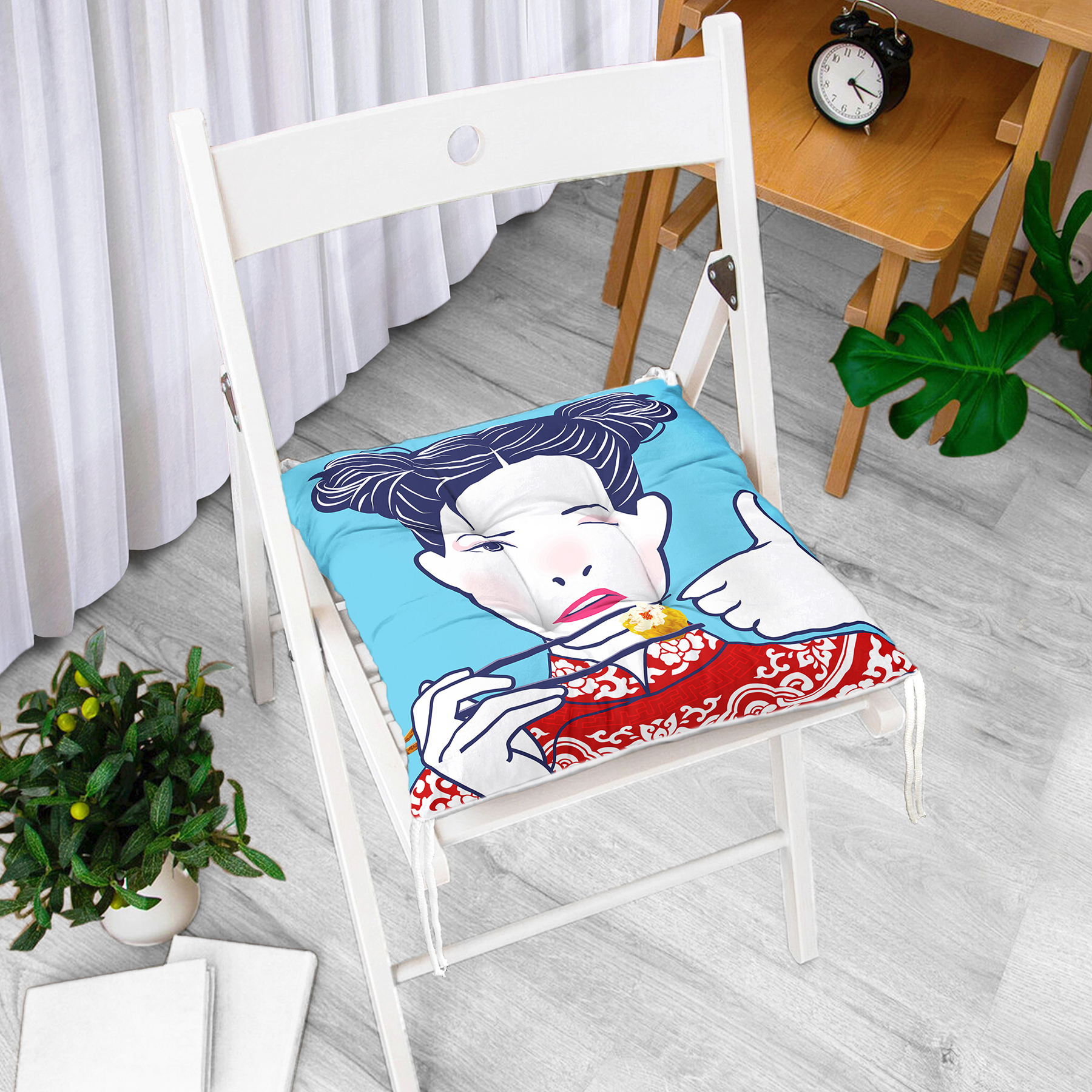 Suşi Yiyen Japon Kız Desenli Modern Pofuduk Sandalye Minderi