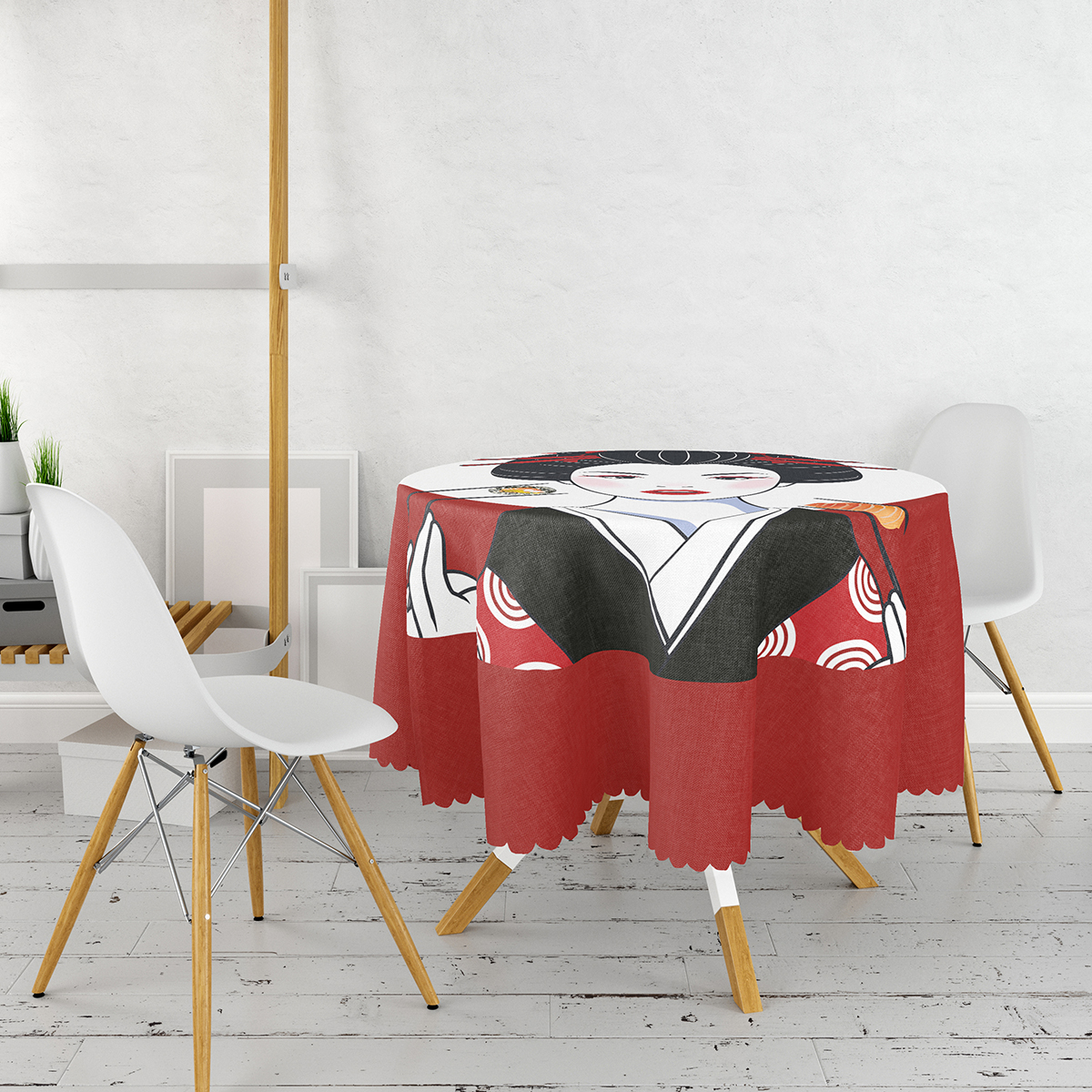 Suşi Yiyen Japon Kız Motifli Modern Yuvarlak Masa Örtüsü – Çap 140cm