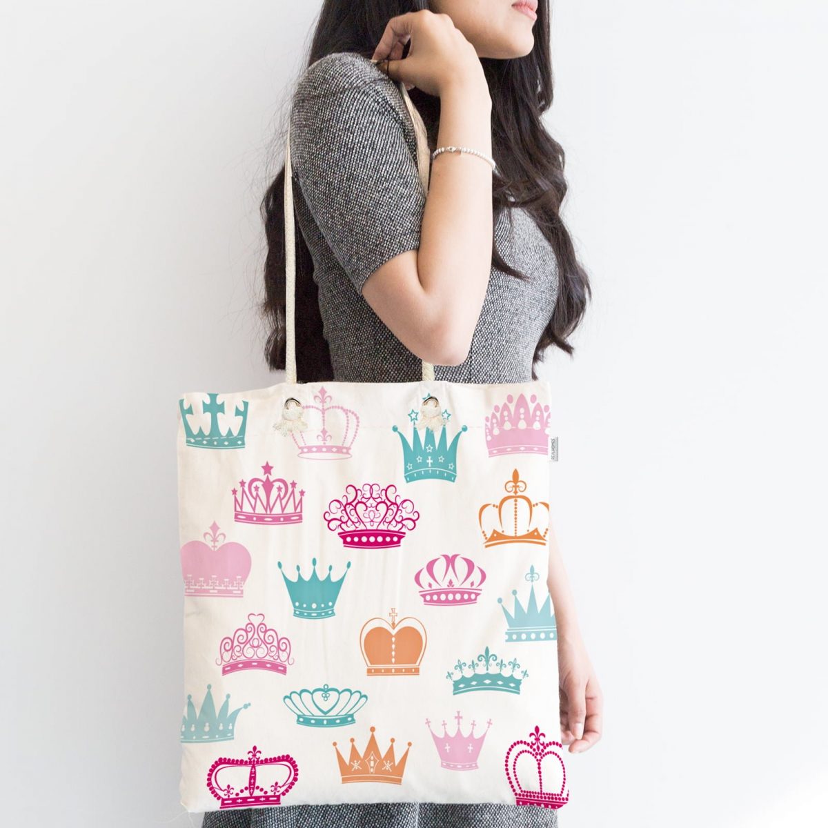 Taç Motifli Renkli Dijital Baskılı Fermuarlı Kumaş Çanta