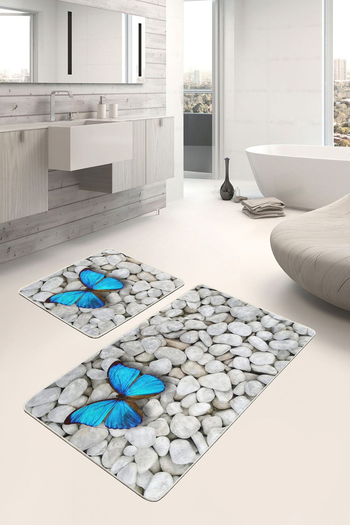 Taş Zemin Mavi Kelebel Dijital Baskılı 2’li Kaymaz Tabanlı Banyo & Mutfak Paspas Takımı