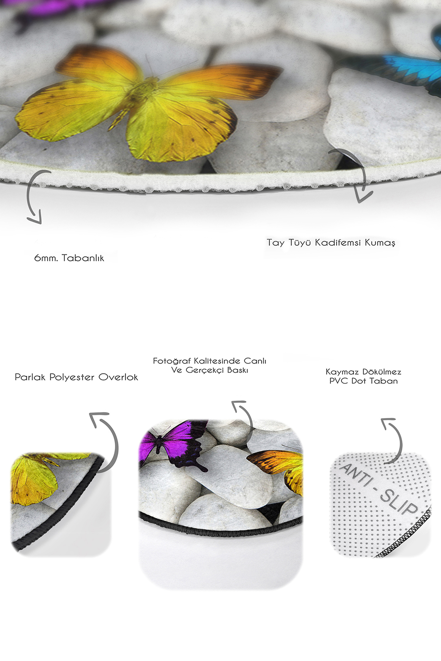 Taş Zemin Renkli Kelebek Tasarımlı 2'li Oval Kaymaz Tabanlı Banyo & Mutfak Paspas Takımı Realhomes