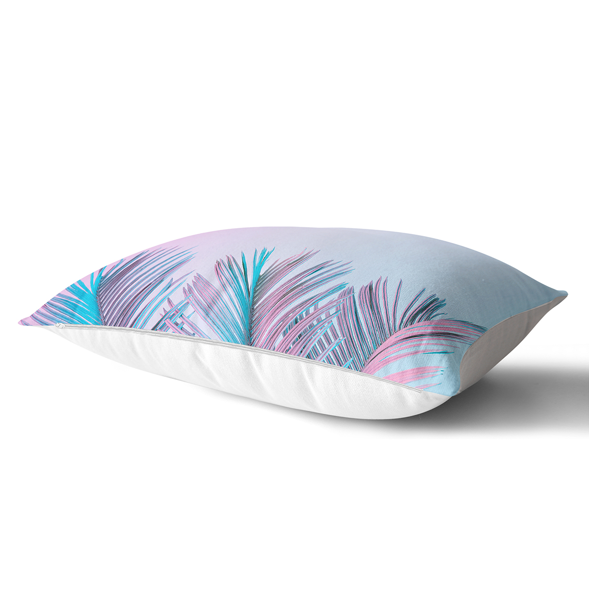Toz Mavisi Zeminli Tropik Yapraklı Özel Tasarım Dijital Baskılı Modern Dikdörtgen Kırlent Kılıfı