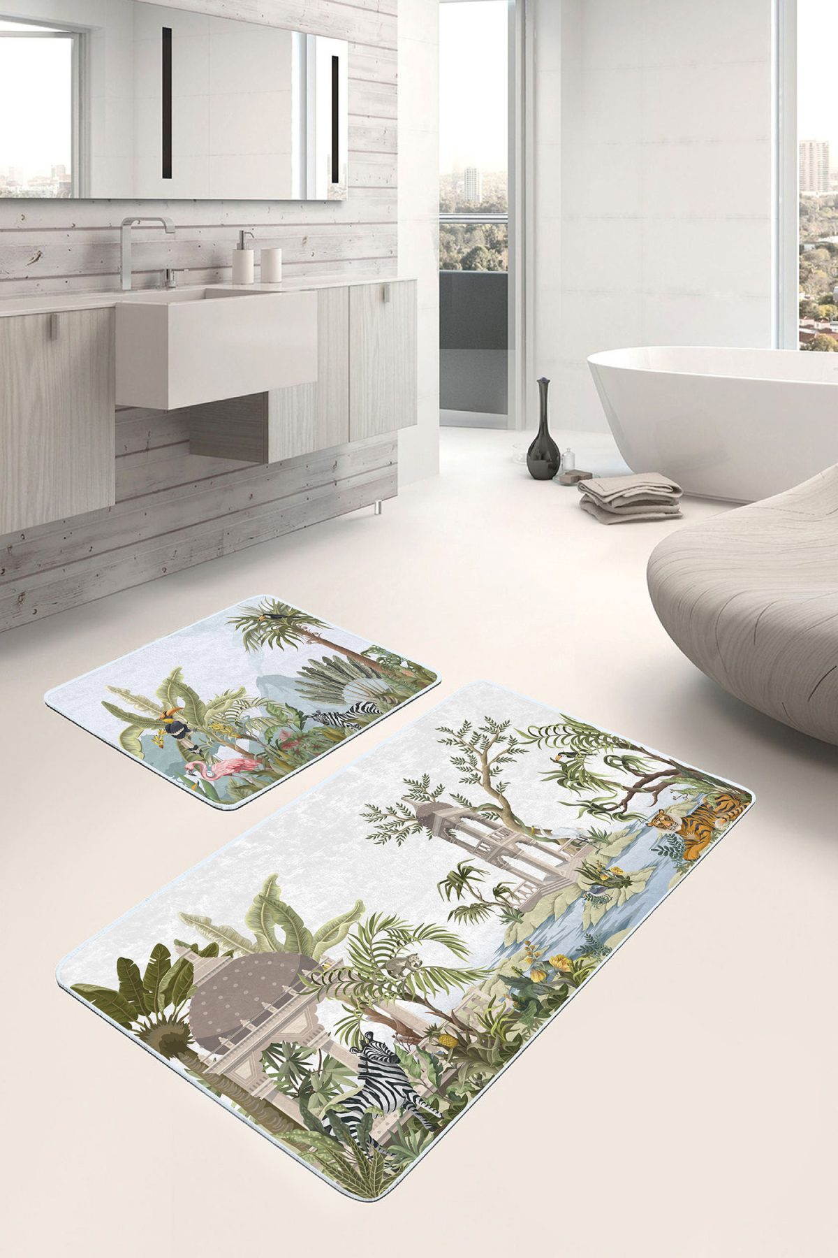 Tropik Hayvanlar Bitkiler Özel Tasarım 2’li Banyo Paspas Seti & Banyo Halı Takımı