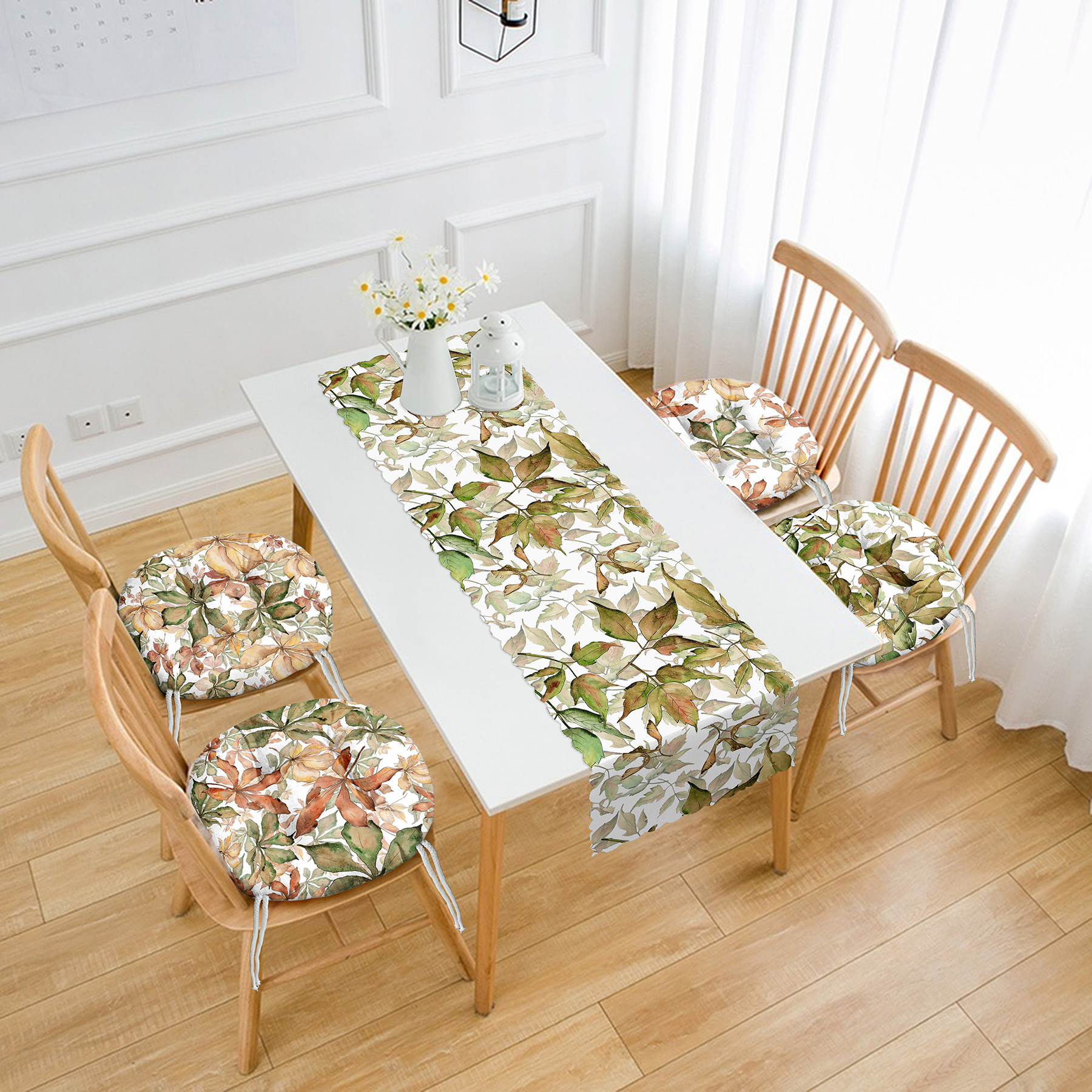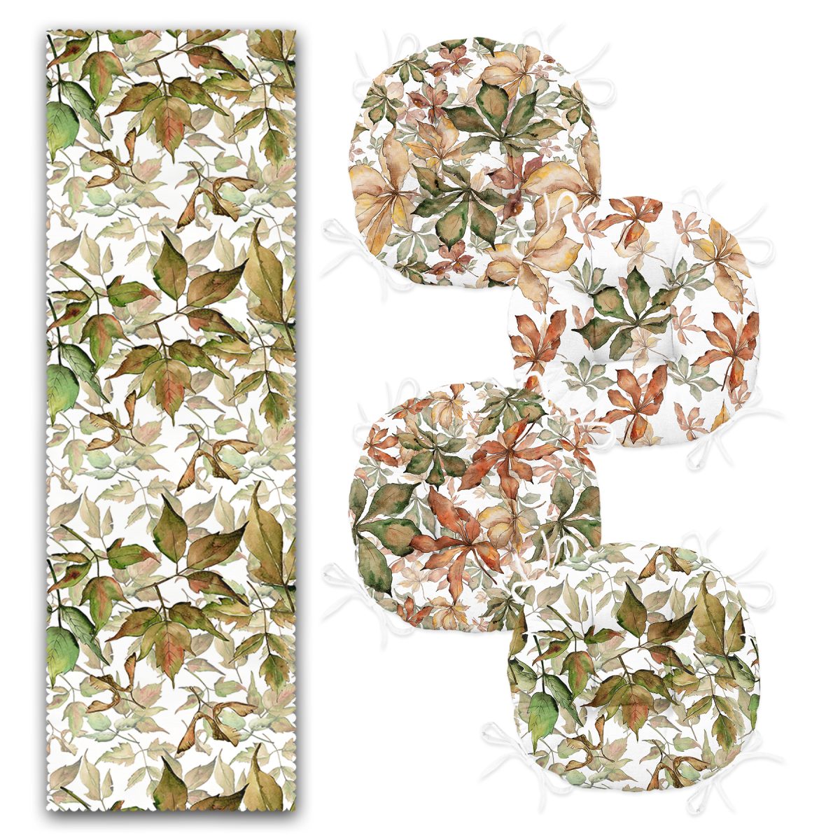 Tropik Sonbahar Yaprak Tasarımlı 4 Yuvarlak Pofuduk Sandalye Minderi ve 1 Runner Seti