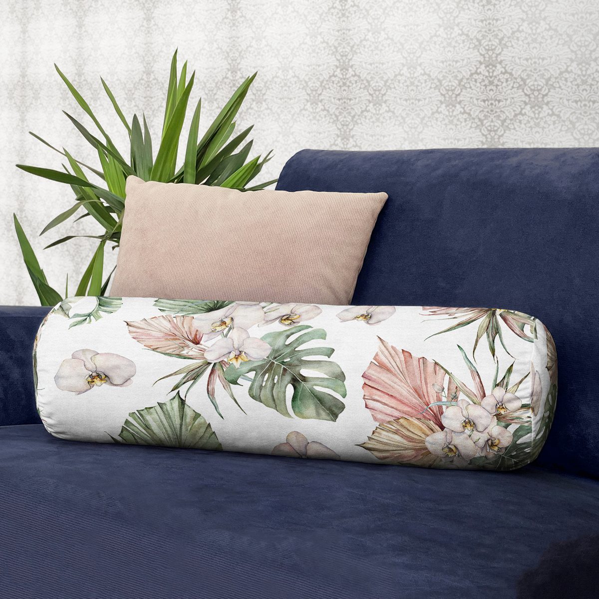 Tropik Yaprak Motifli Dijital Baskılı Modern İç Dolgulu – Fermuarlı Süet Silindir Rulo Yastık Kırlent