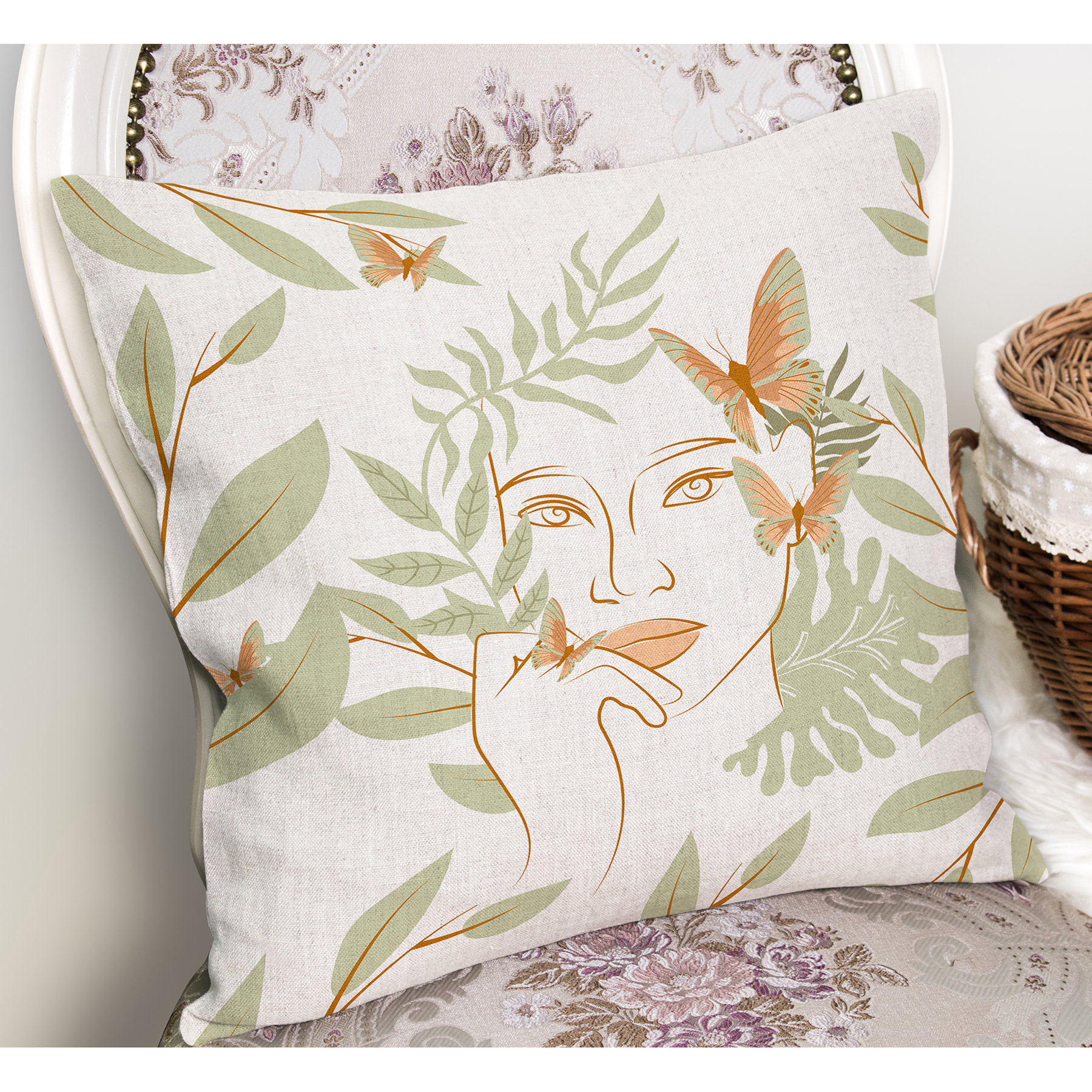 Tropik Yaprak Motifli Kadın Suretli Dijital Baskılı Yastık Kırlent Kılıfı