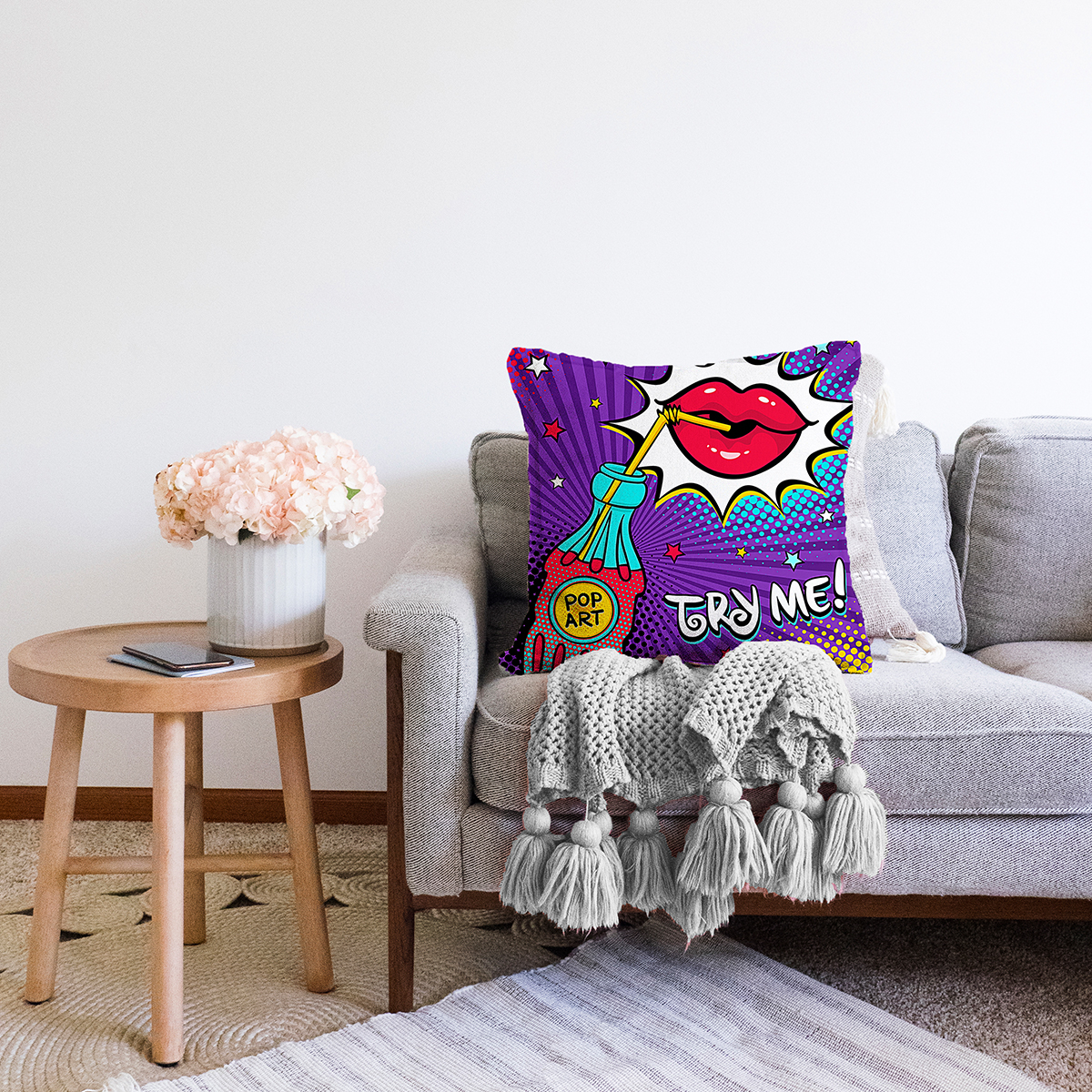 Try Me Pop Art Özel Tasarımlı Dijital Baskılı Modern Raşel Kadife Yastık Kırlent Kılıfı