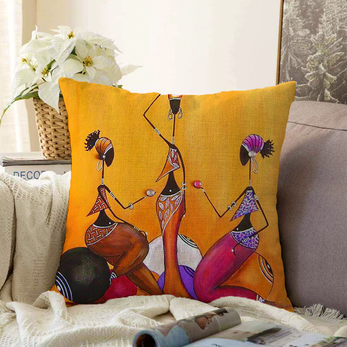 Turuncu Zemin Üç Afrikalı Kadın Çizimi Dijital Baskılı Dekoratif Raşel Kadife Yastık Kırlent Kılıfı