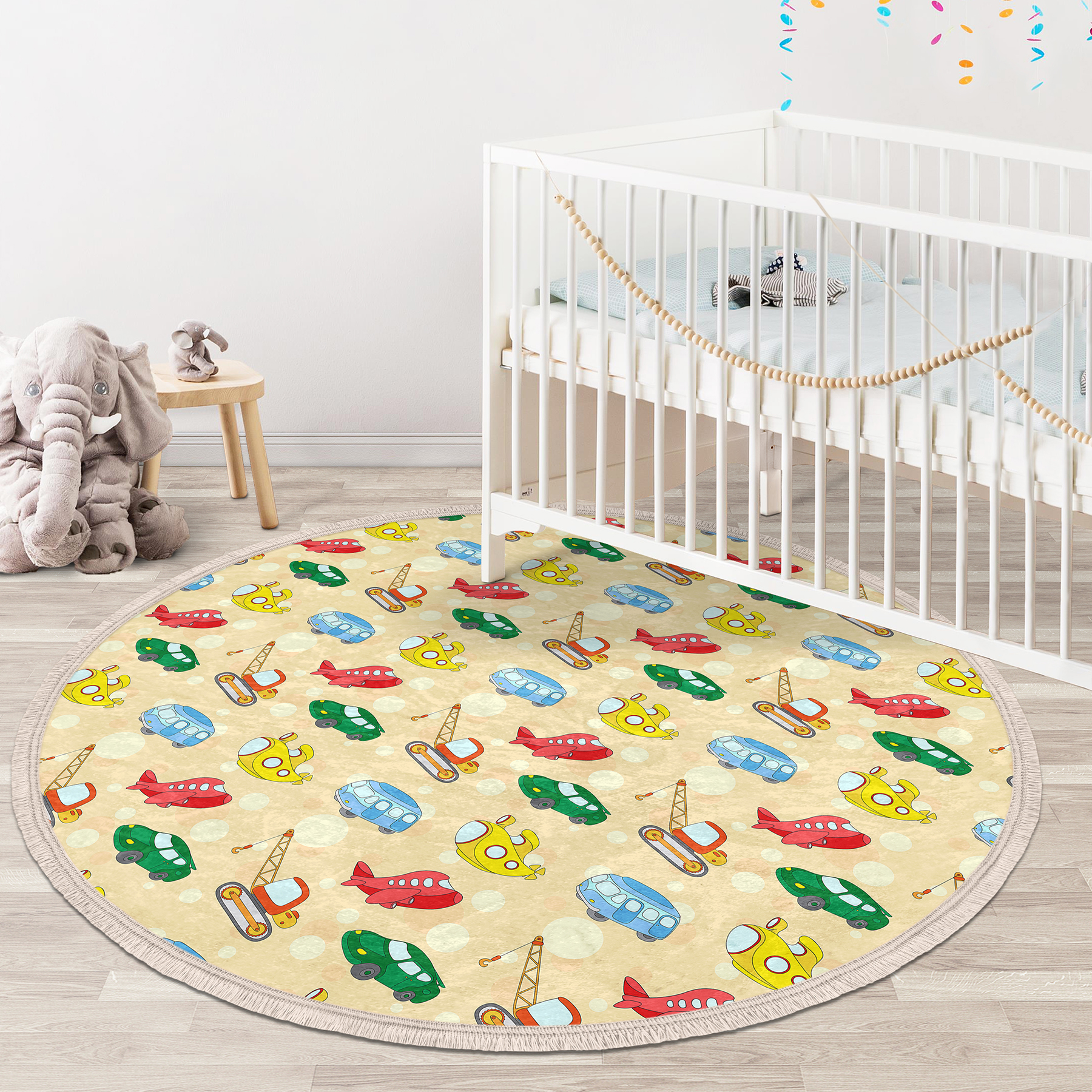 Uçak Tren Araba Oyuncak Figürlü Çocuk & Genç Odası Makinede Yıkanabilir Kaymaz Tabanlı Püsküllü Yuvarlak Çocuk Halısı