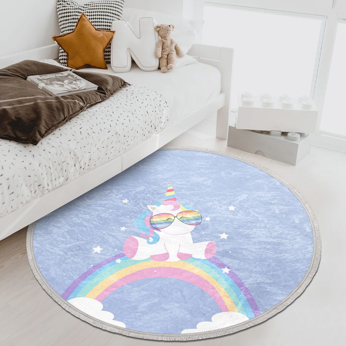 Unicorn Party Yazılı Çocuk & Genç Odası Makinede Yıkanabilir Kaymaz Tabanlı Püsküllü Yuvarlak Çocuk Halısı