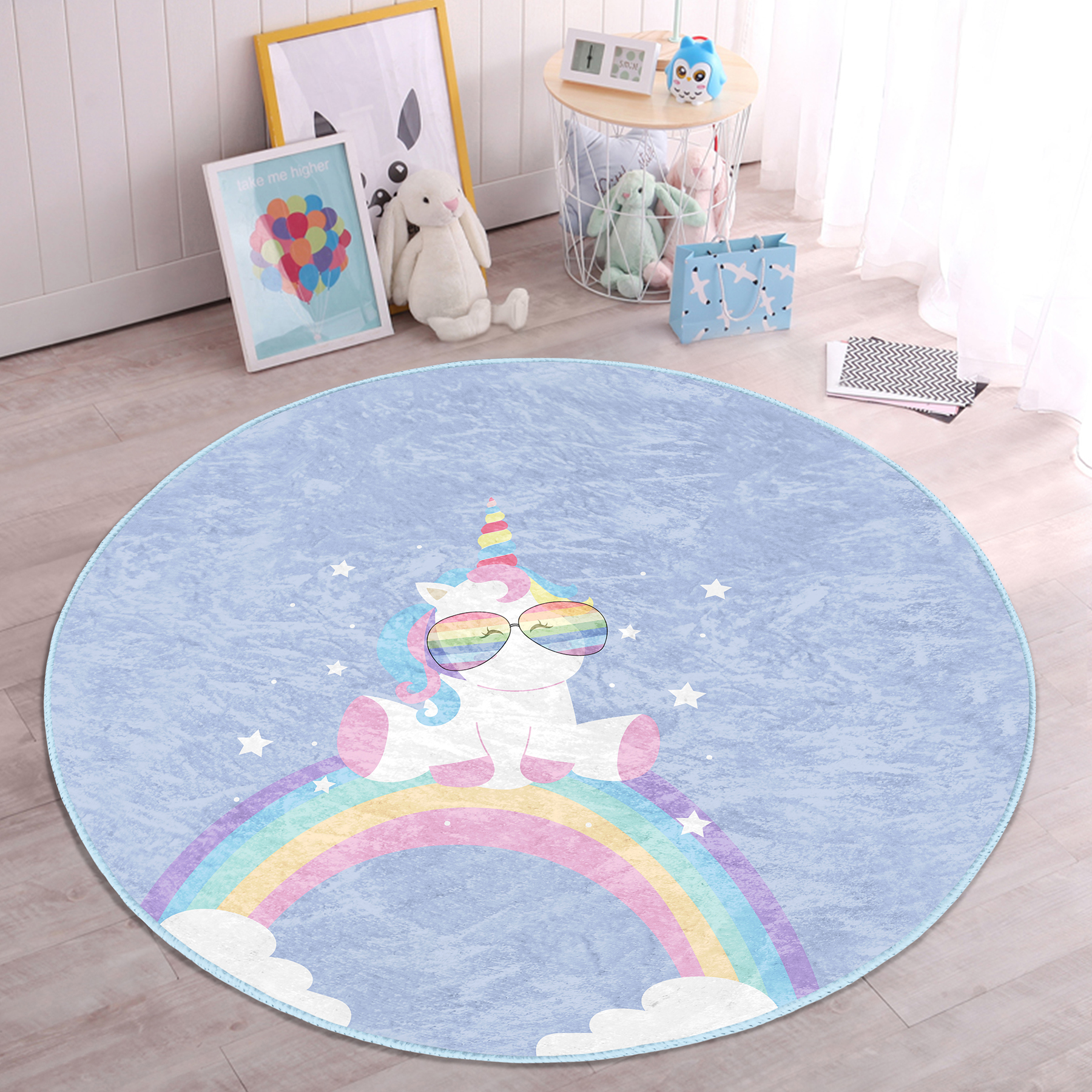 Unicorn Party Yazılı Çocuk & Genç Odası Makinede Yıkanabilir Kaymaz Tabanlı Yuvarlak Çocuk Halısı