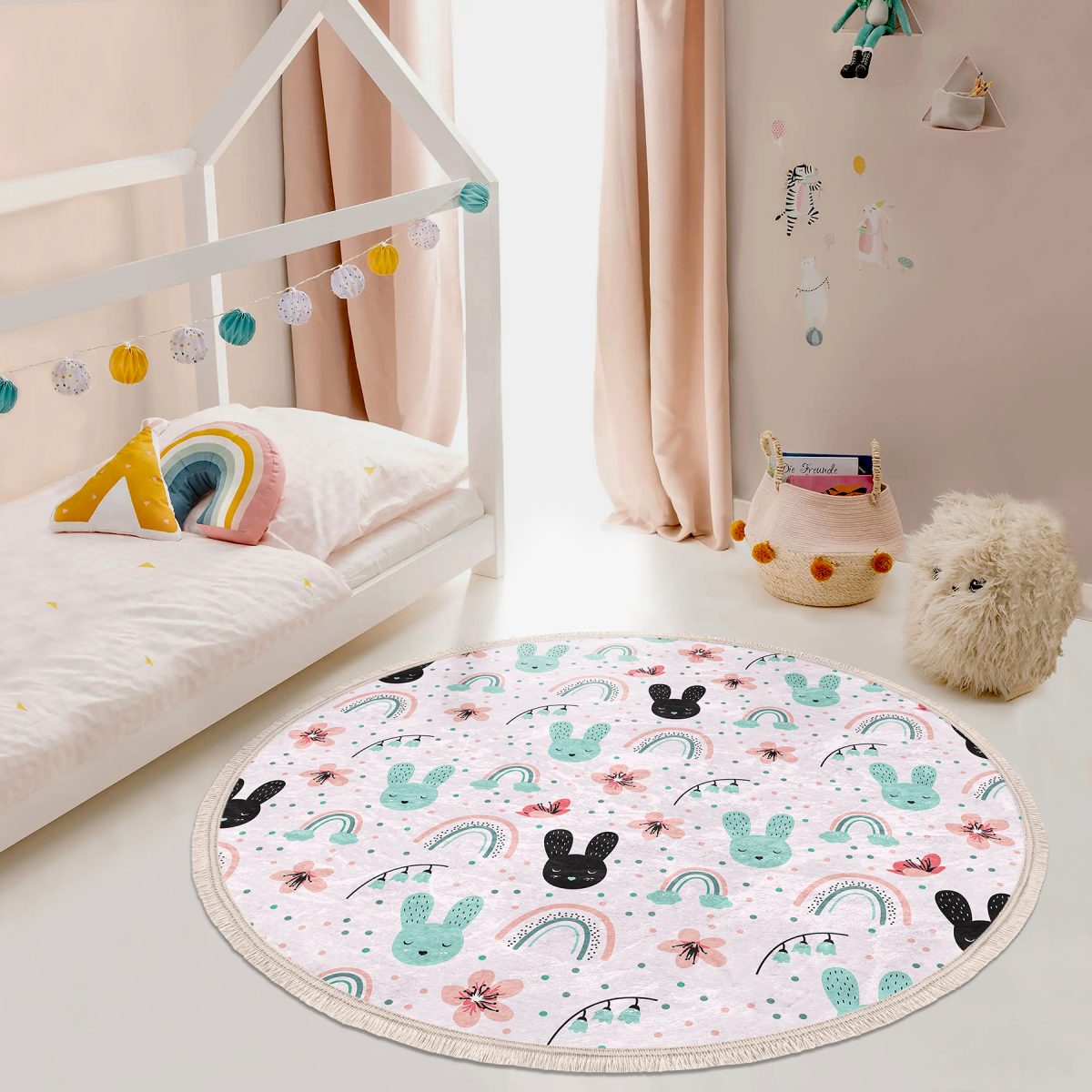 Uyku Odası Temalı Tavşan Desenli Çocuk & Genç Odası Makinede Yıkanabilir Kaymaz Tabanlı Püsküllü Yuvarlak Çocuk Halısı