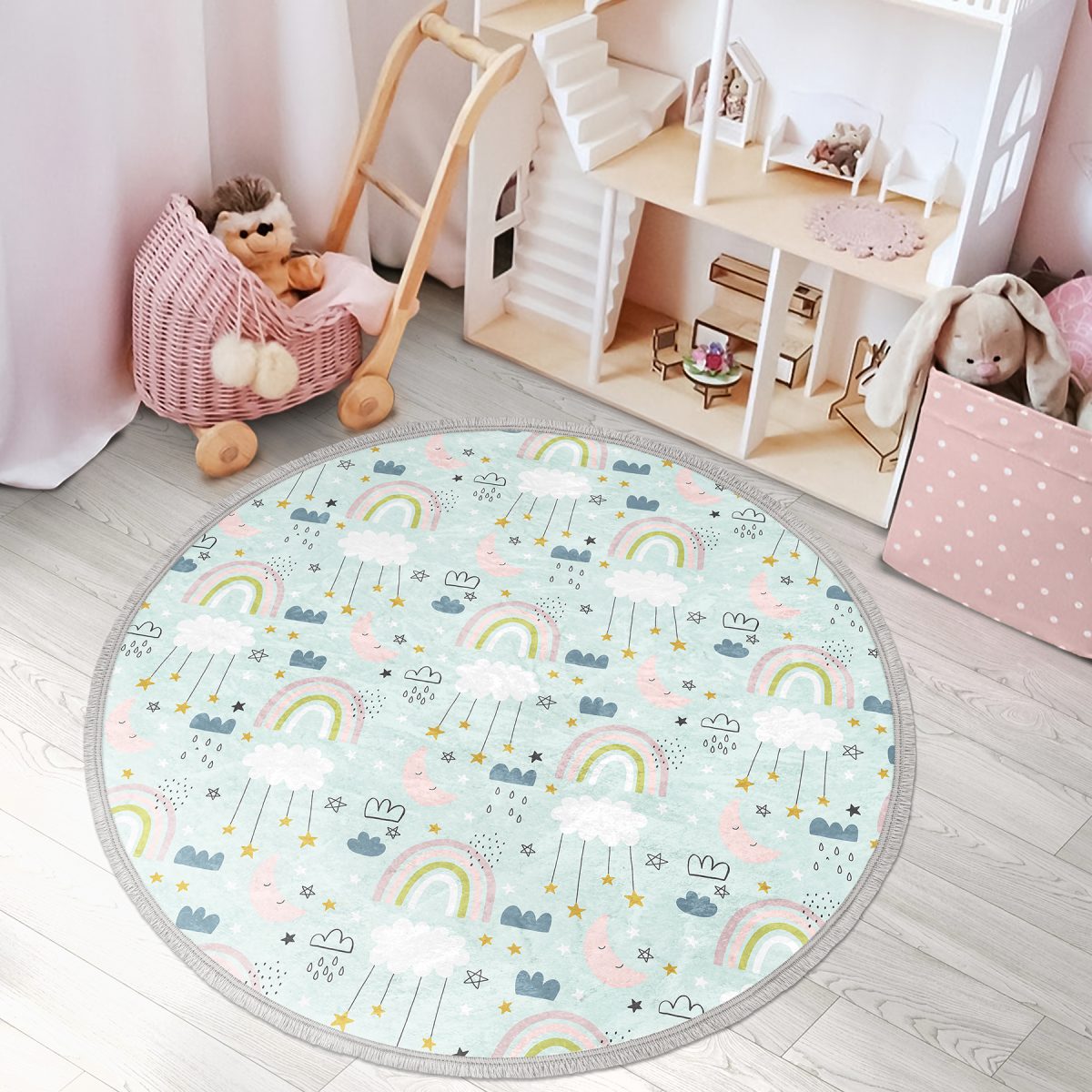 Uyku Saati Temalı Çocuk & Genç Odası Makinede Yıkanabilir Kaymaz Tabanlı Püsküllü Yuvarlak Çocuk Halısı