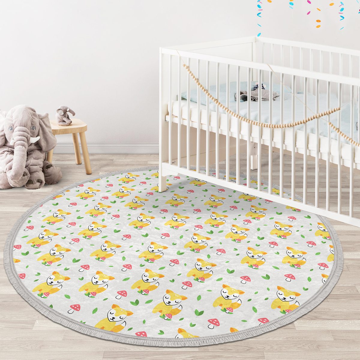 Uyuyan Köpek Desenli Çocuk & Genç Odası Makinede Yıkanabilir Kaymaz Tabanlı Püsküllü Yuvarlak Çocuk Halısı