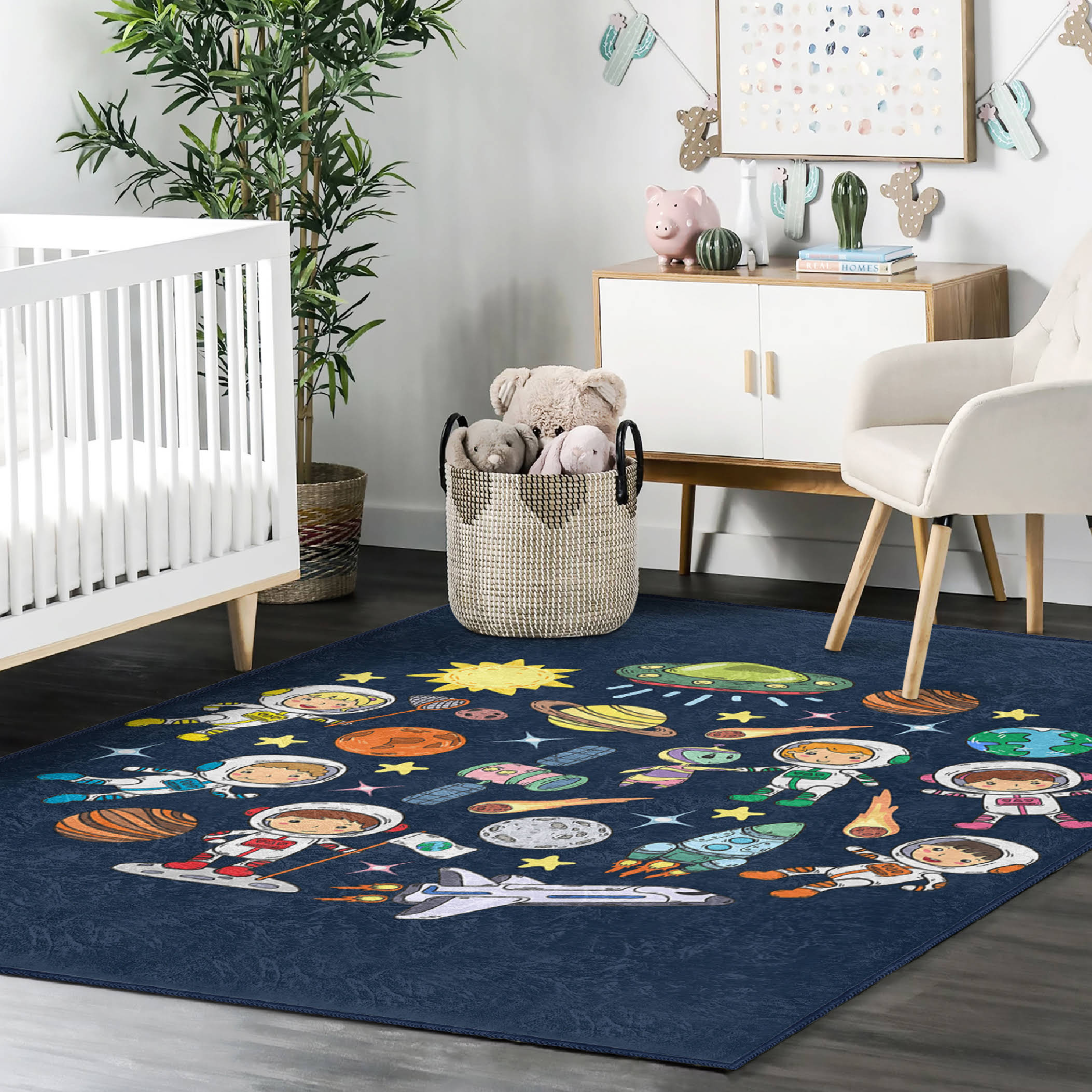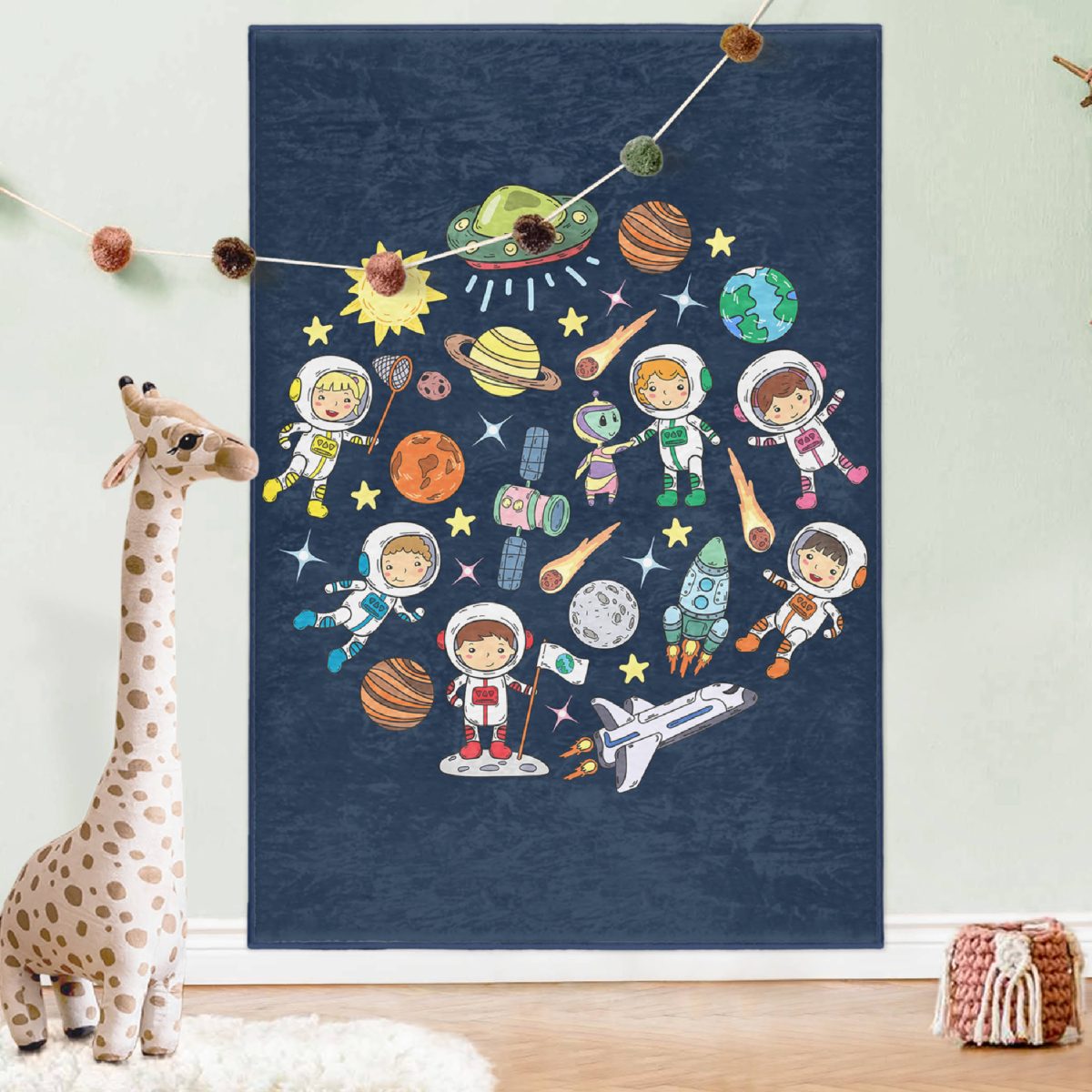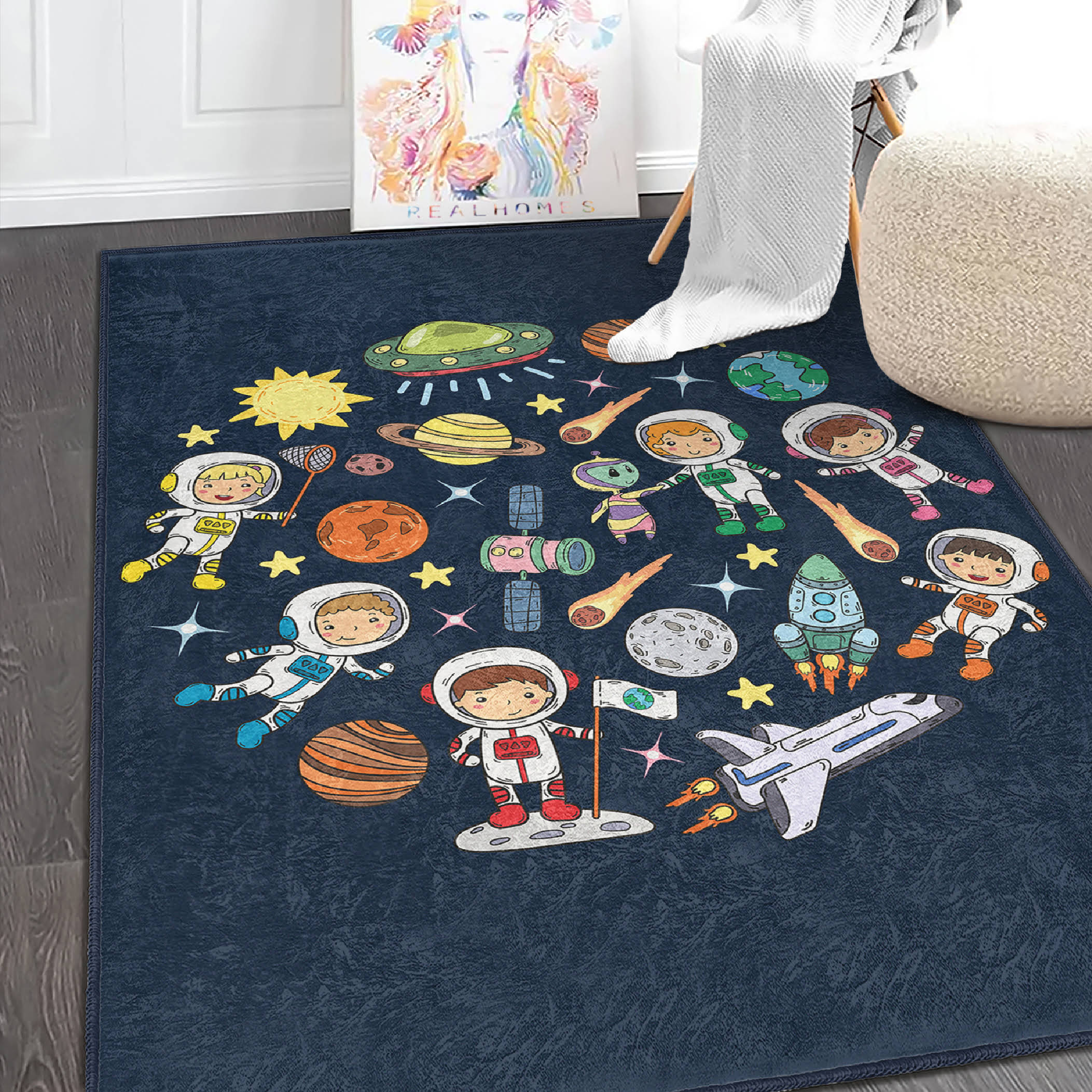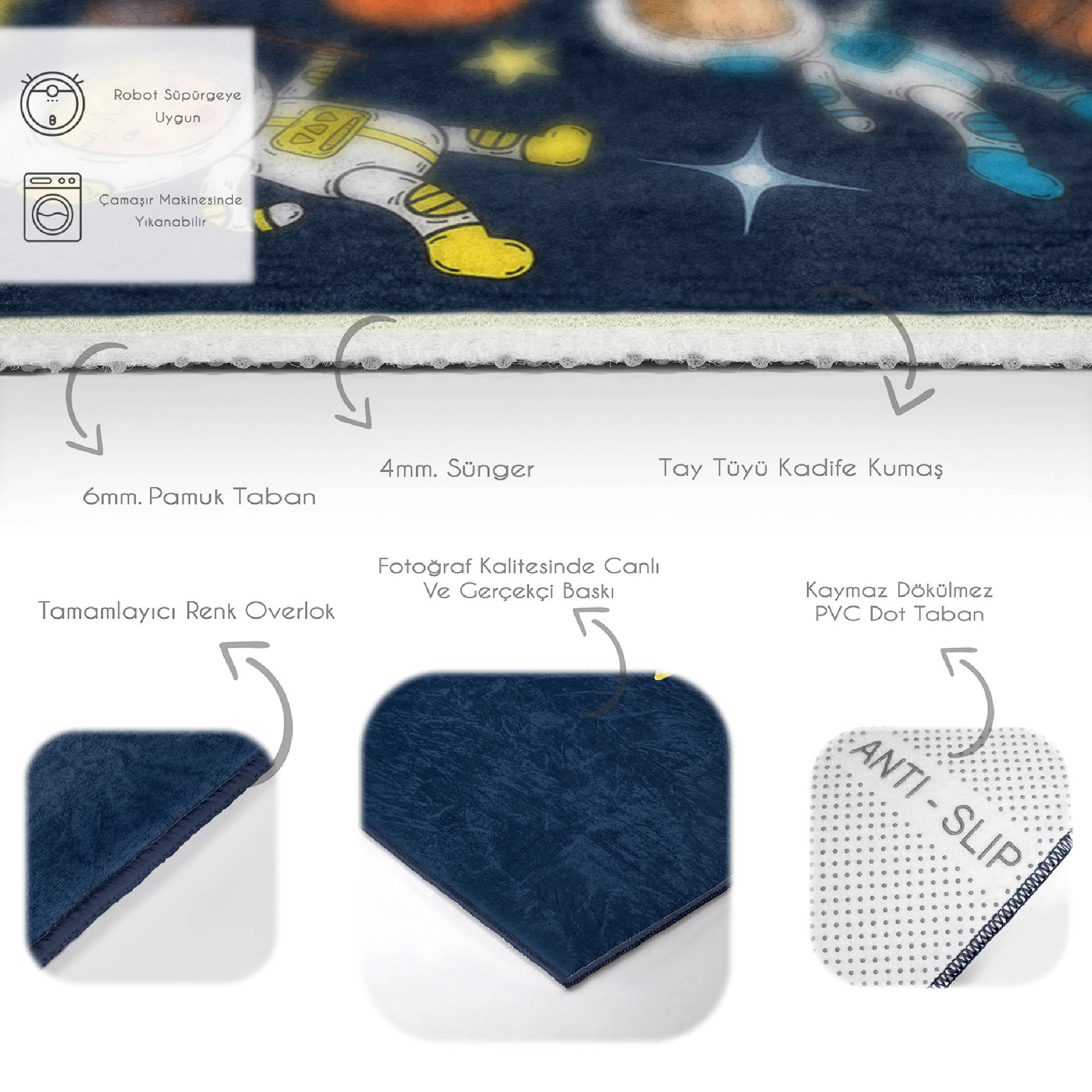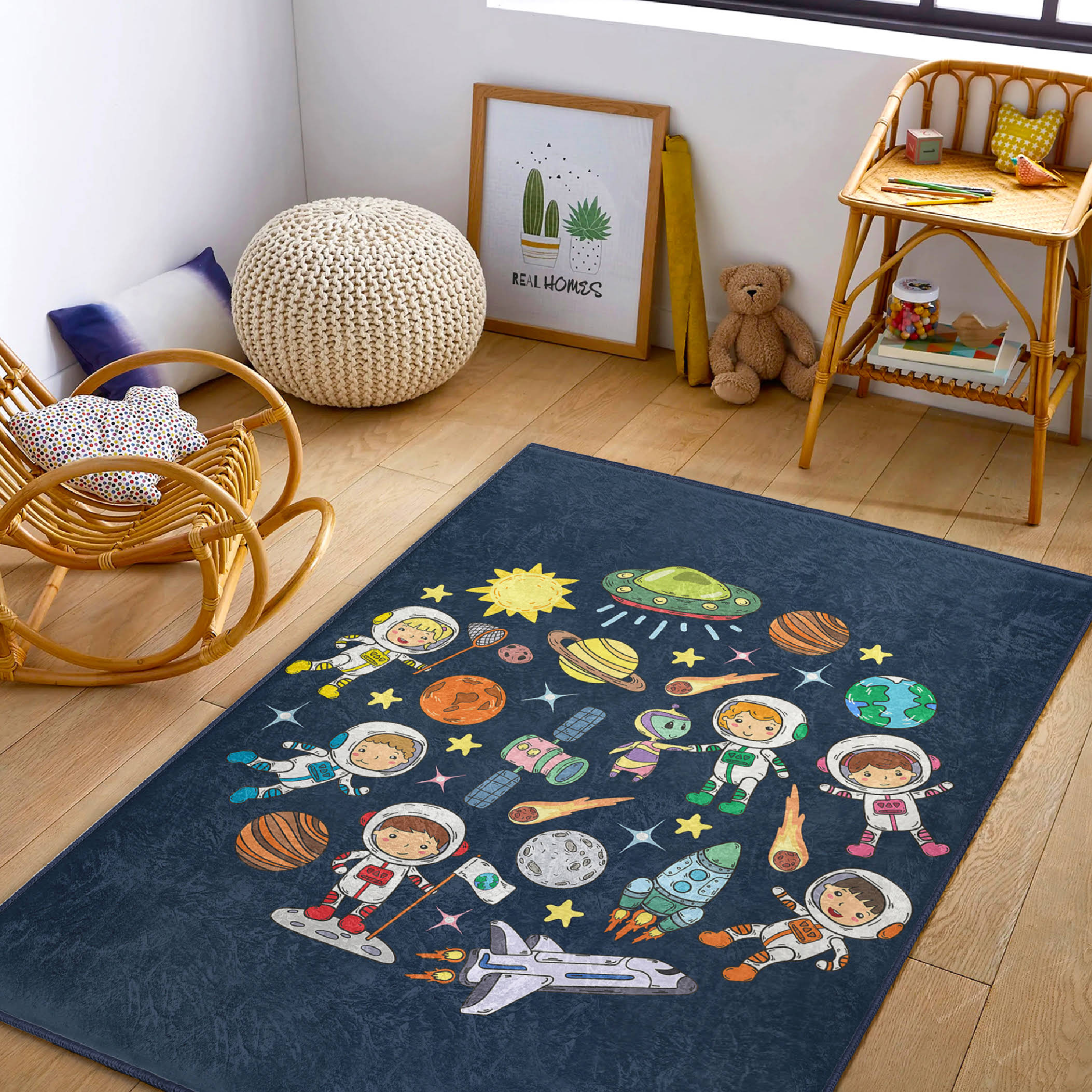 Uzay Motifli Astronot Tasarımlı Çocuk & Genç Odası Makinede Yıkanabilir Kolay Temizlenebilir Kaymaz Tabanlı Dikdörtgen Çocuk Halısı