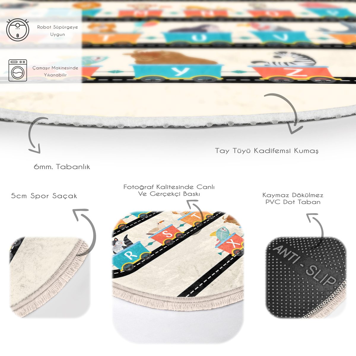 Vagon Vagon Eğitici Harfler Motifli Çocuk & Genç Odası Makinede Yıkanabilir Kaymaz Tabanlı Püsküllü Yuvarlak Çocuk Oyun Halısı