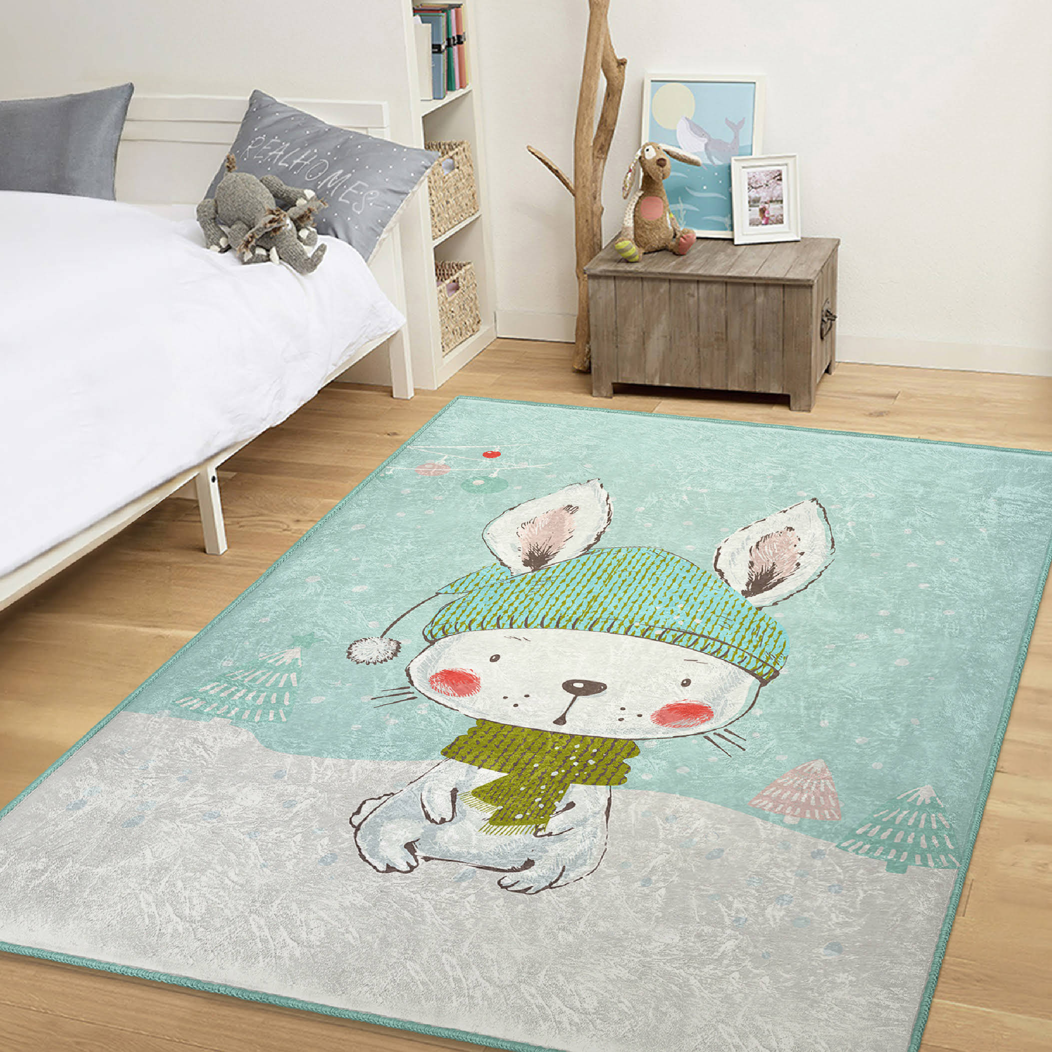 Winter Tavşan Motifli Çocuk & Genç Odası Makinede Yıkanabilir Kaymaz Tabanlı Pamuk Tabanlı Özel Ölçü Leke Tutmaz Dikdörtgen Çocuk Odası Halısı