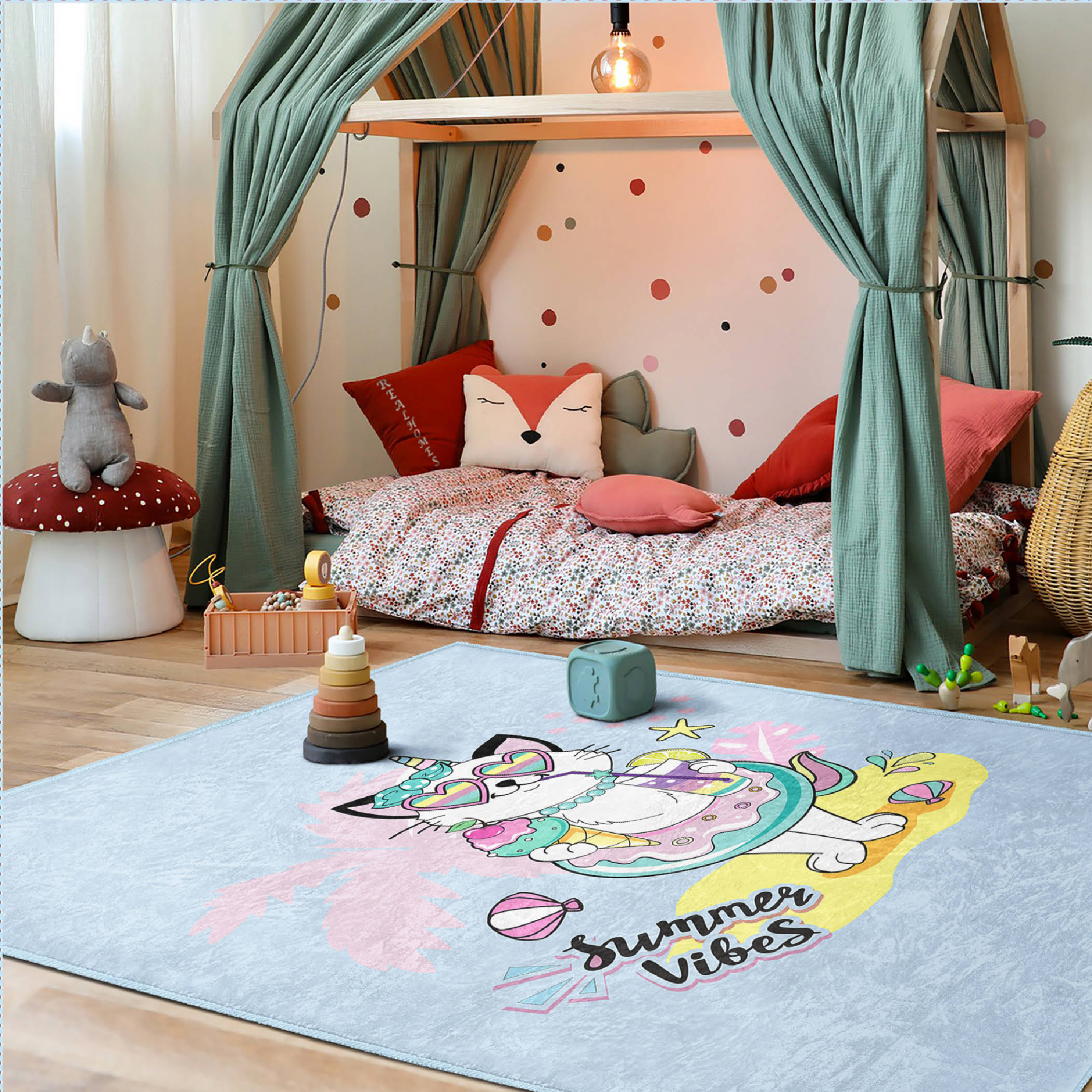 Yaz Temalı Unicorn Kedi Tasarımlı Çocuk & Genç Odası Makinede Yıkanabilir Kaymaz Tabanlı Kolay Temizlenebilir Leke Tutmaz Dikdörtgen Çocuk Odası Halısı