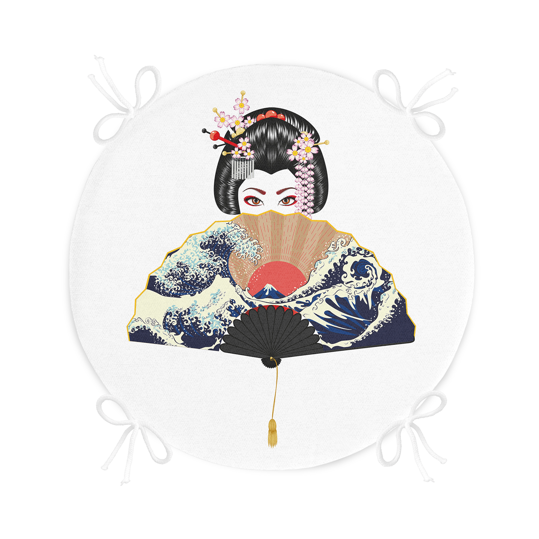 Yelpazeli Japan Kadın Motifli Yuvarlak Fermuarlı Sandalye Minderi