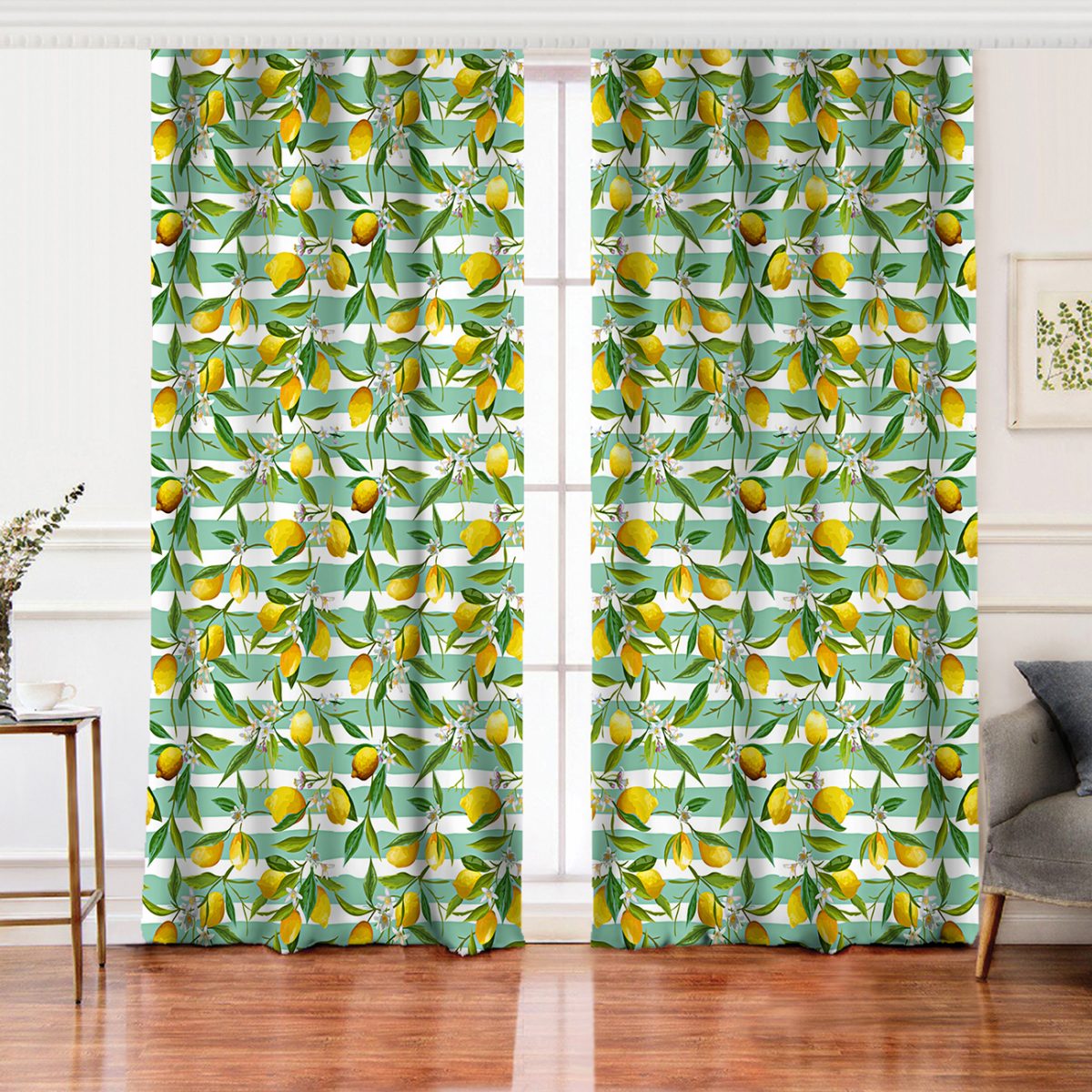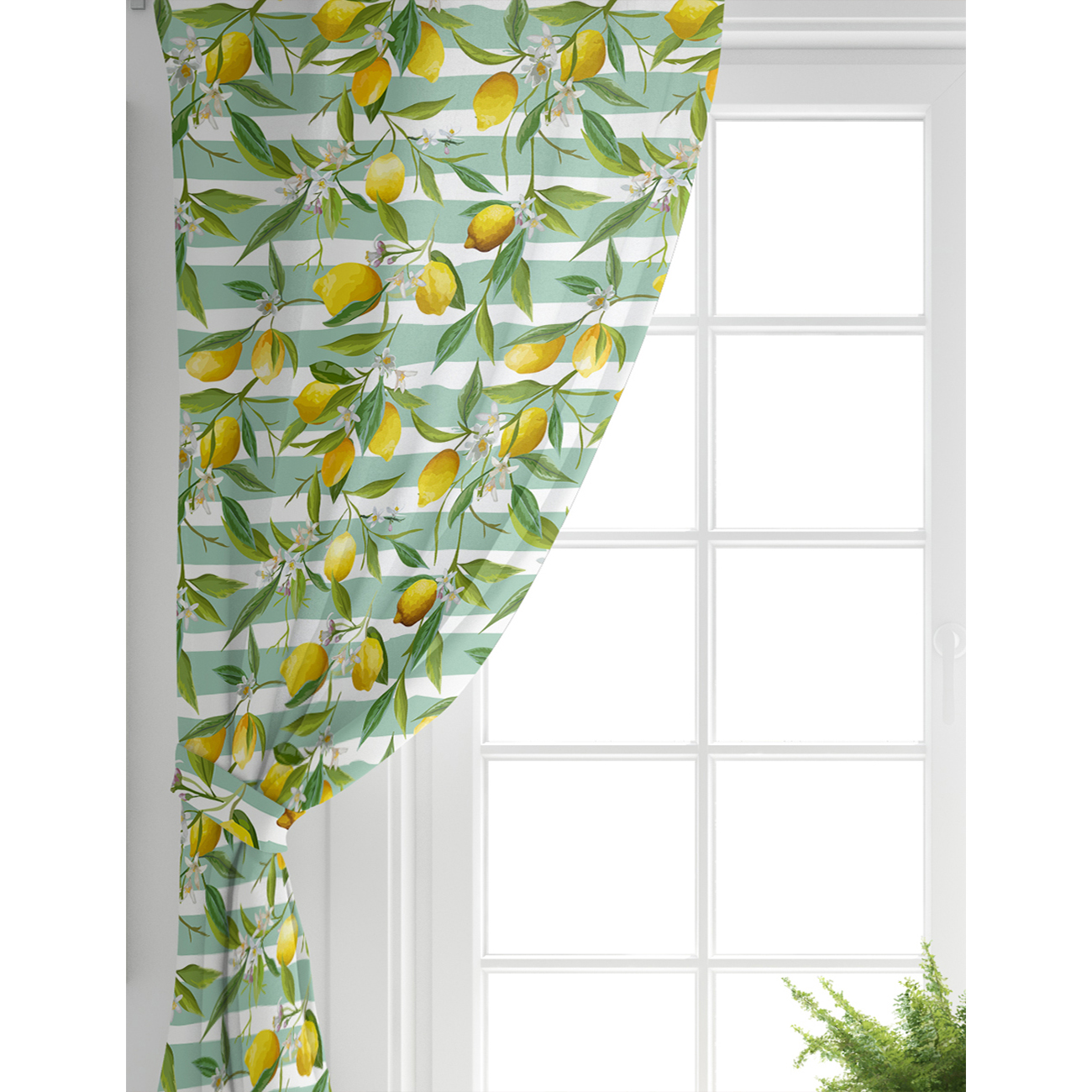 Yeşil Çizgili Limon Desenli Dijital Baskılı Salon Fon Perde