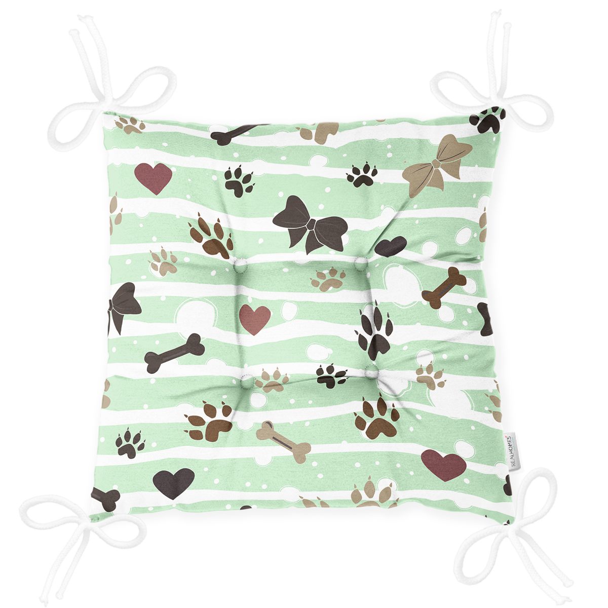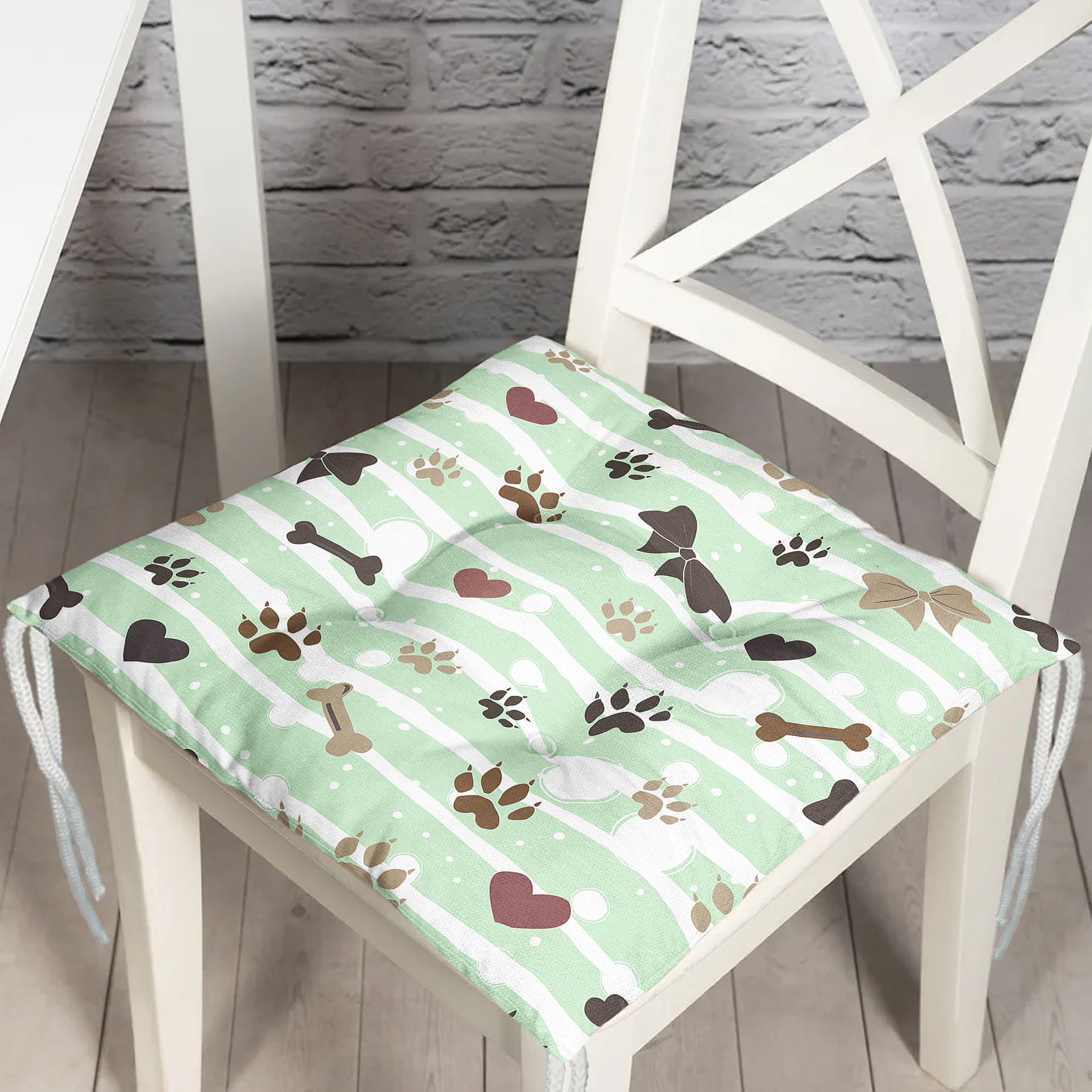 Yeşil Çizgili Zeminde Pati İzli Dijital Baskılı Modern Pofuduk Sandalye Minderi