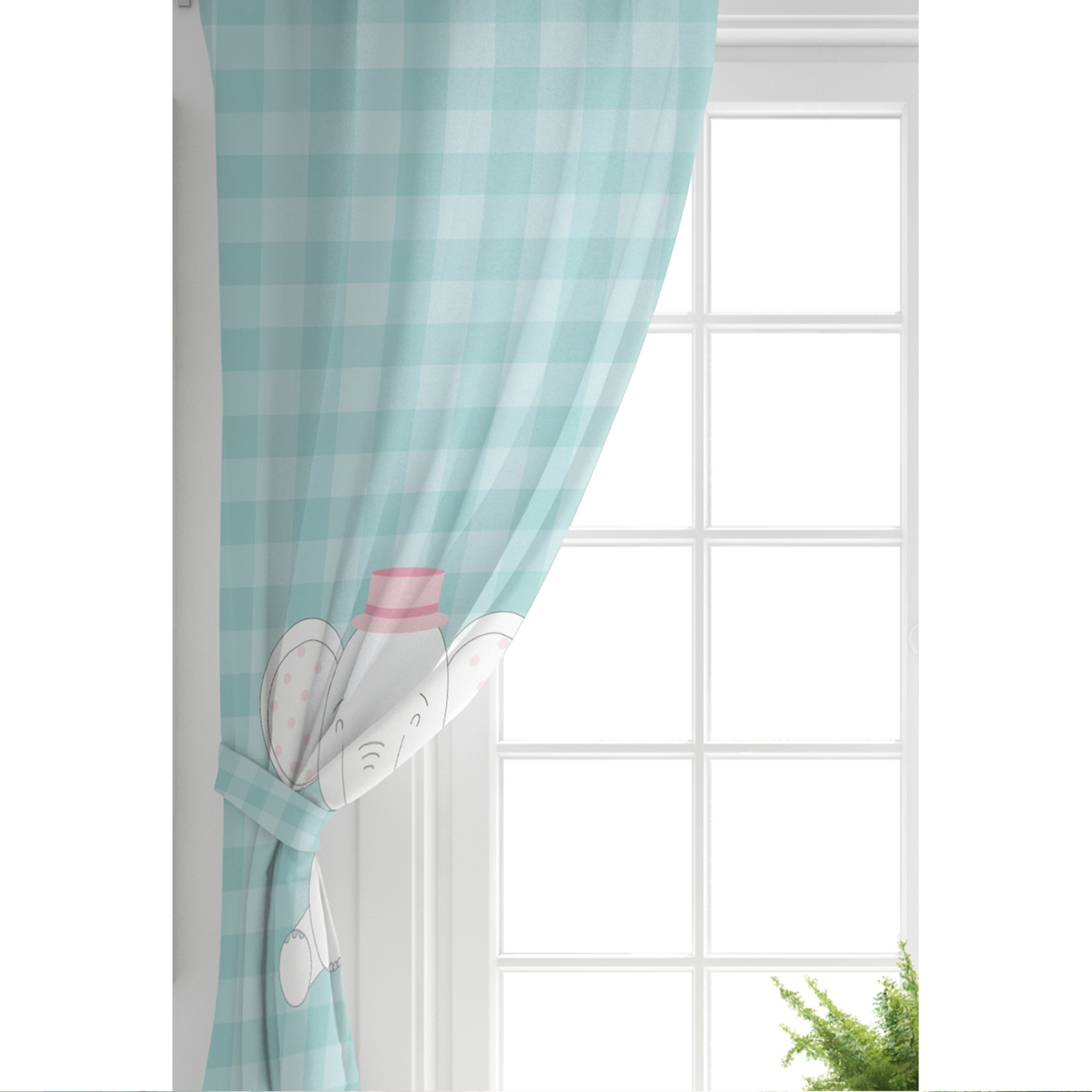 Yeşil Ekose Zeminli Fil Desenli Bebek Odası Fon Perde