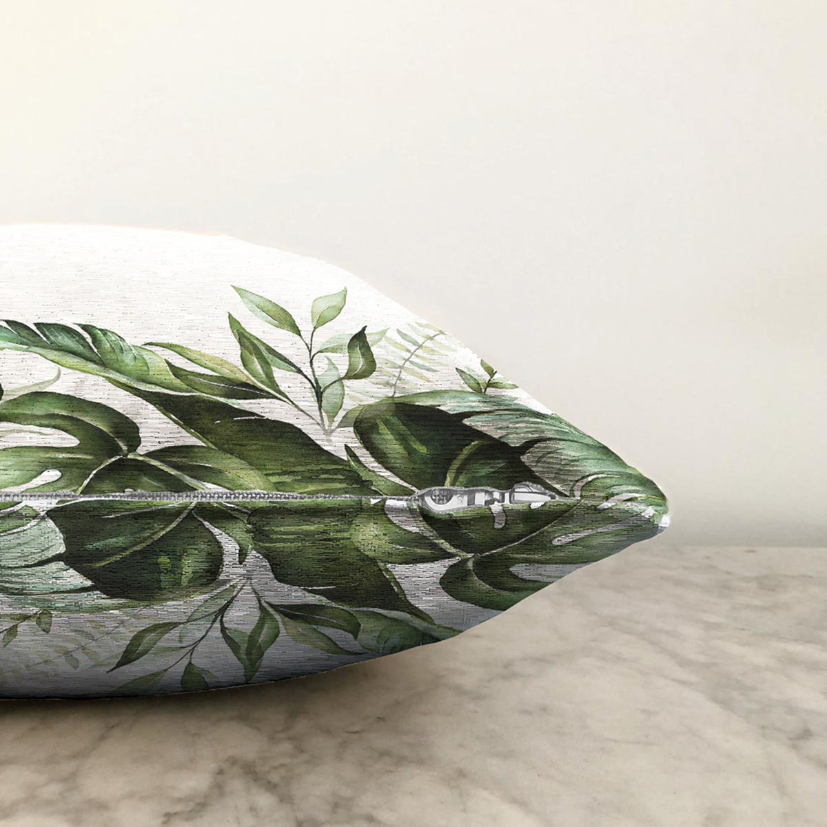 Yeşil Tropik Yaprak Motifli Dijital Baskılı Dekoratif Raşel Kadife Yastık Kırlent Kılıfı