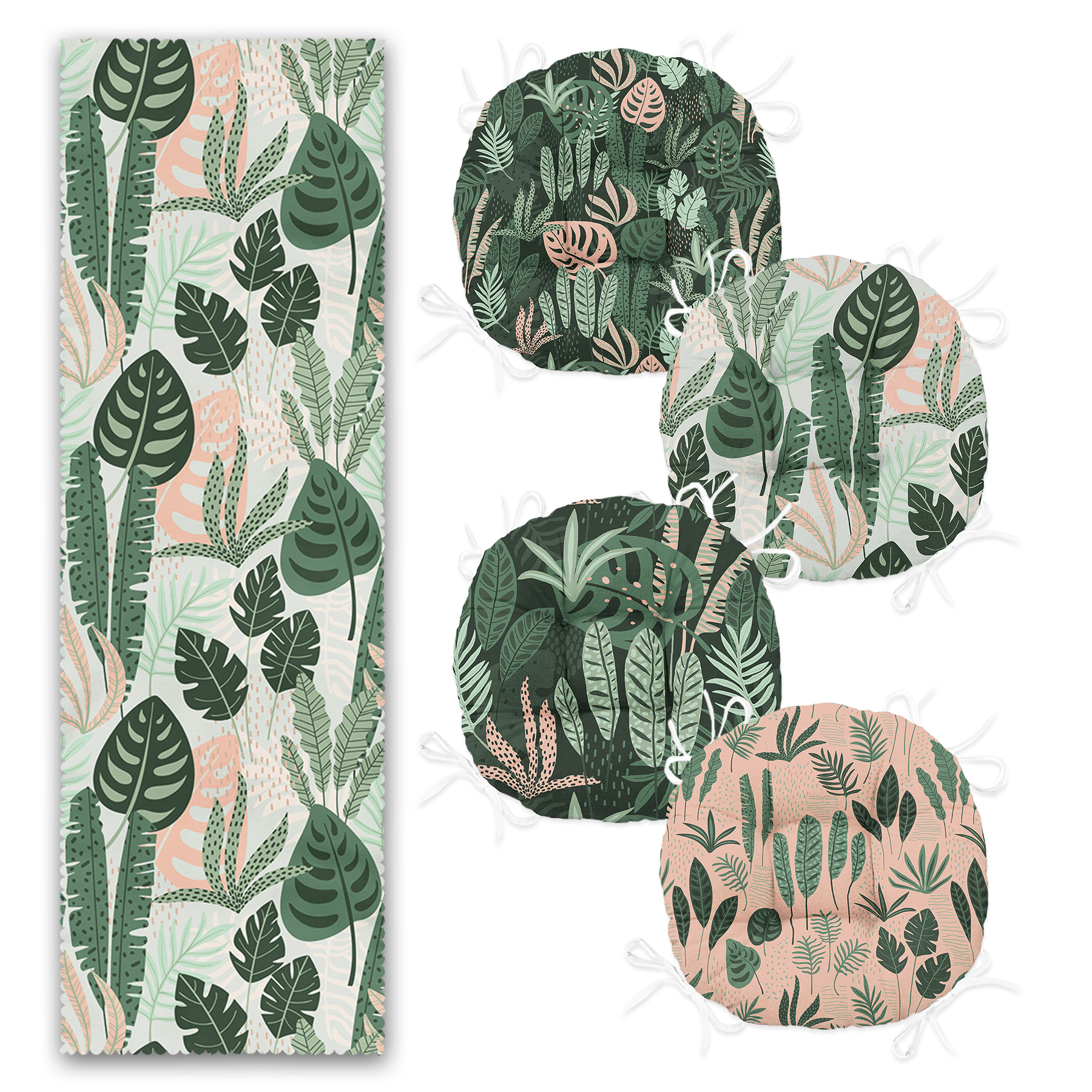 Yesil Tropik Yaprak Tasarımlı 4 Yuvarlak Pofuduk Sandalye Minderi ve 1 Runner Seti Realhomes