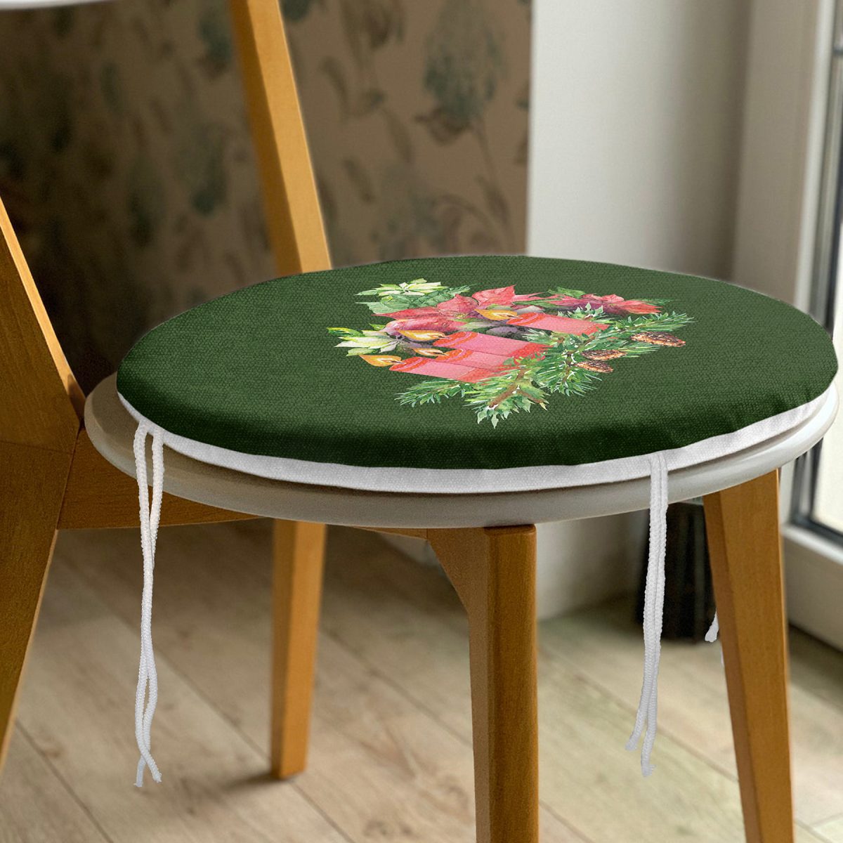 Yeşil Zemin Çam Yapraklı Mum Tasarımlı Dijital Baskılı Modern Yuvarlak Fermuarlı Sandalye Minderi