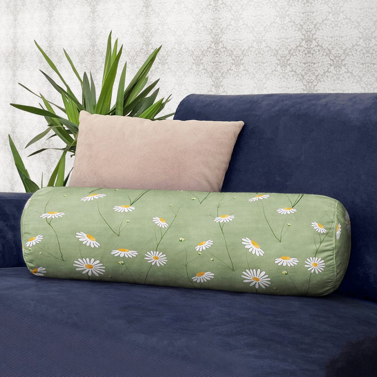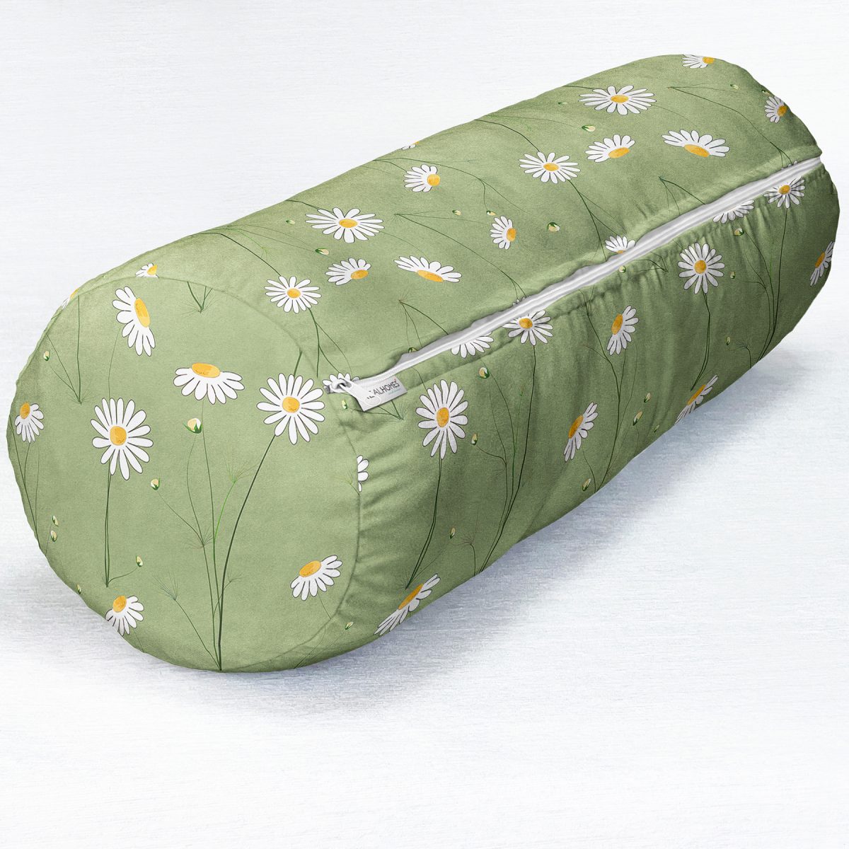 Yeşil Zemin Papatyalar Dijital Baskılı Dekoratif İç Dolgulu Süet Silindir Yastık Kırlent – Bel Yastığı