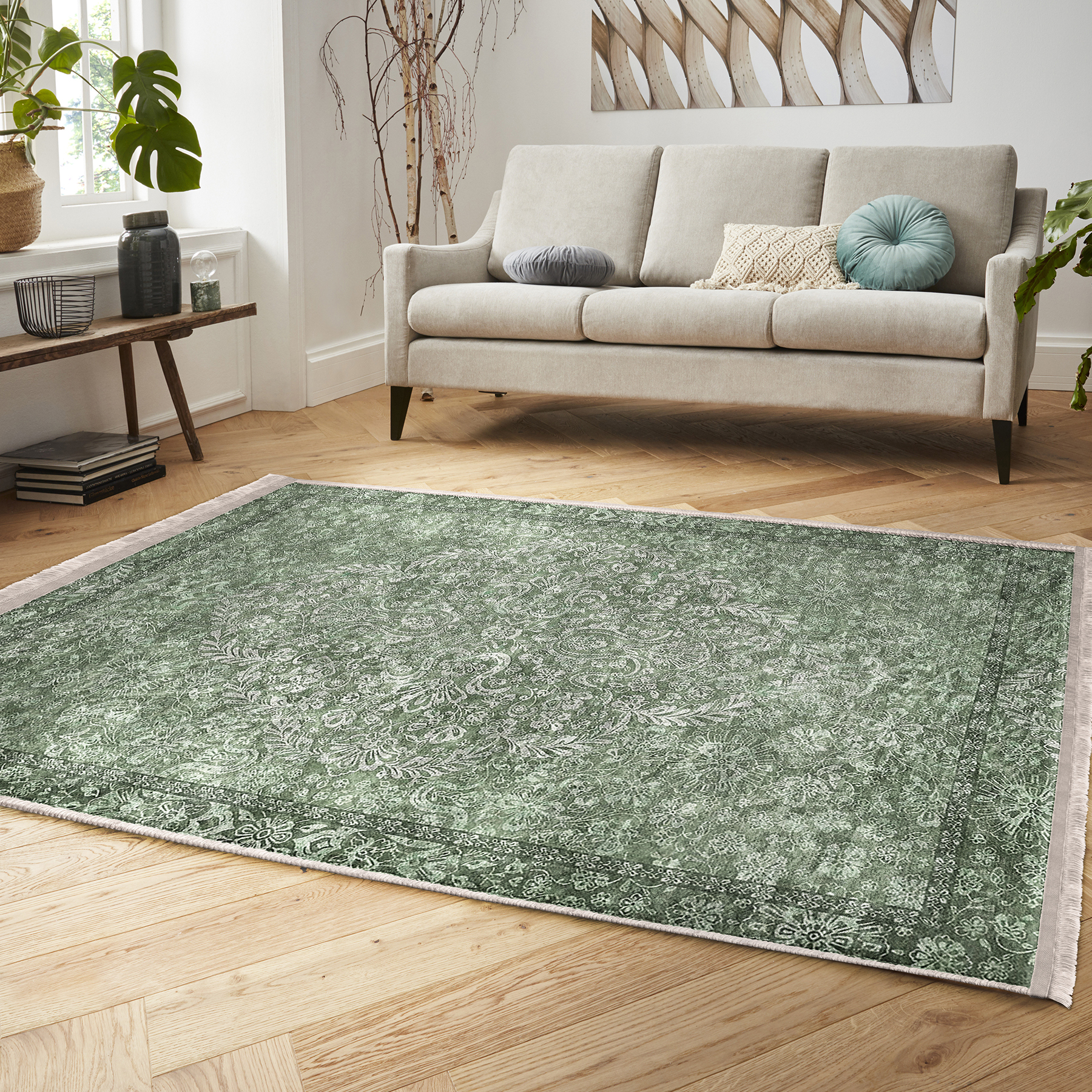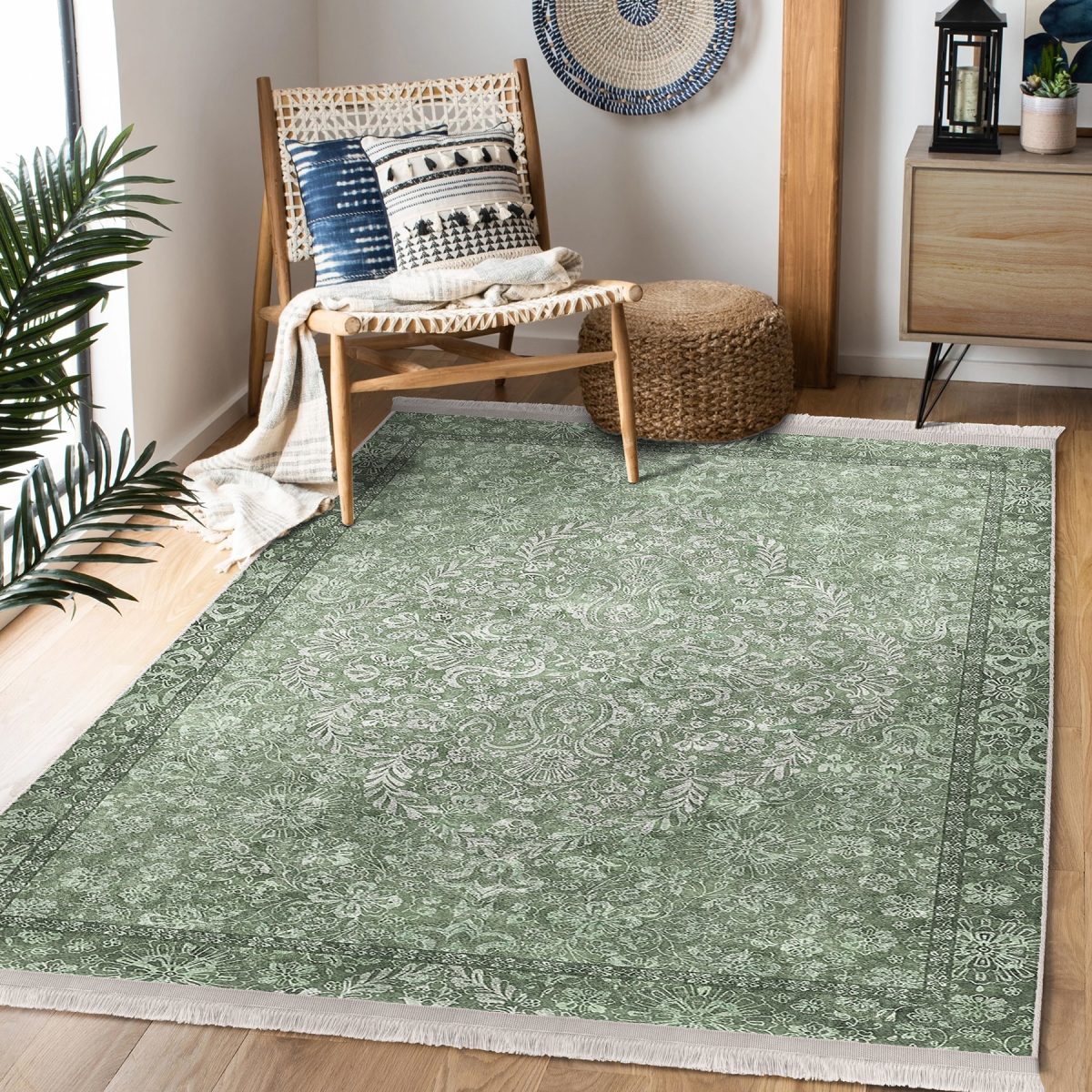 Yeşil Zeminde Çerçeveli Motifli Etnik Desenli Avangarde Klasik Salon & Oturma Odası Banyo Dijital Baskılı Makinede Yıkanabilir Kaymaz Taban Saçaklı Halı